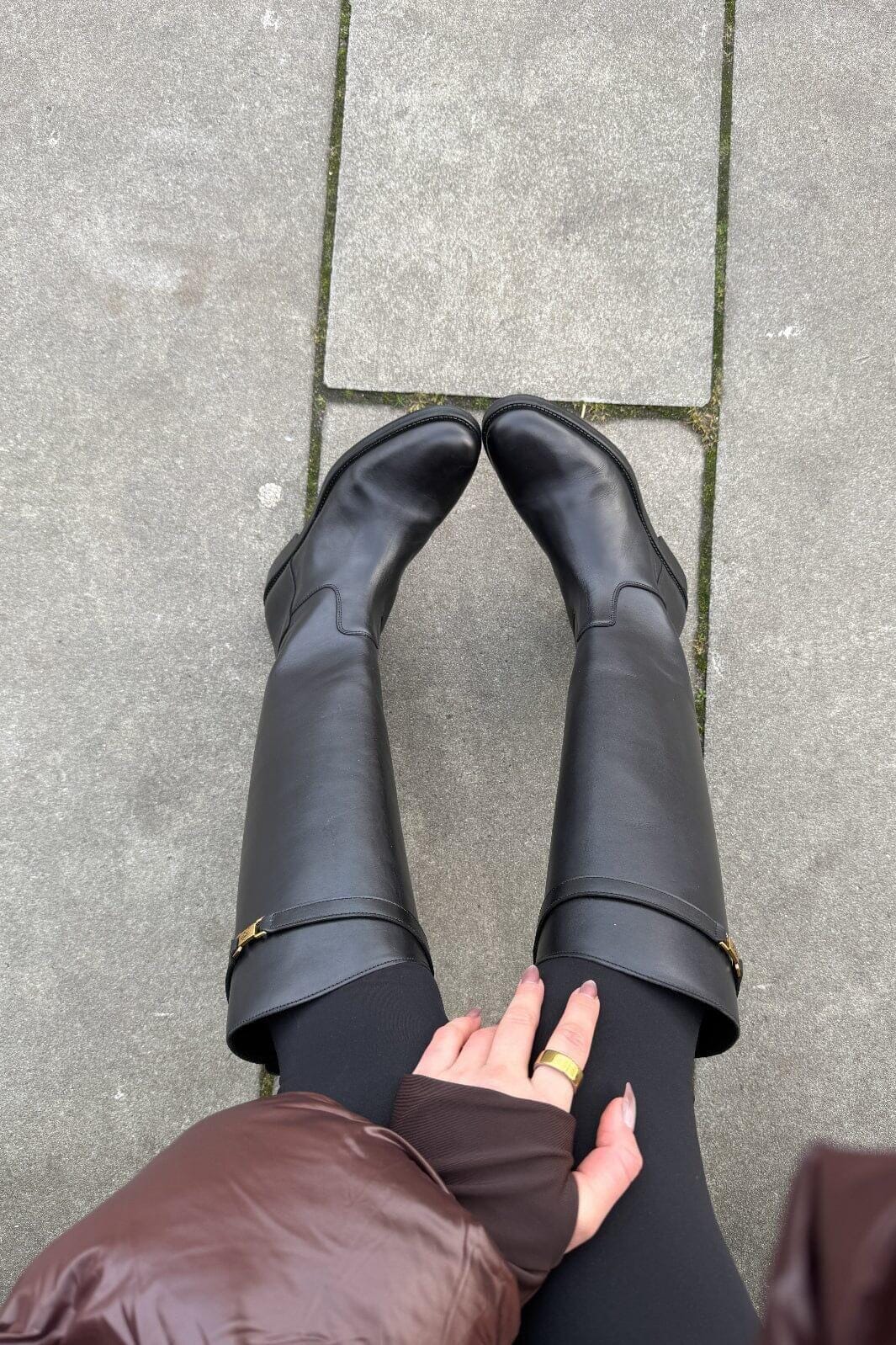 Høy støvel fra Phenumb Copenhagen, laget av svart skinn. Støvelen har et høyt skaft som går opp til kneet, og et dekorativt spenne nær toppen.
