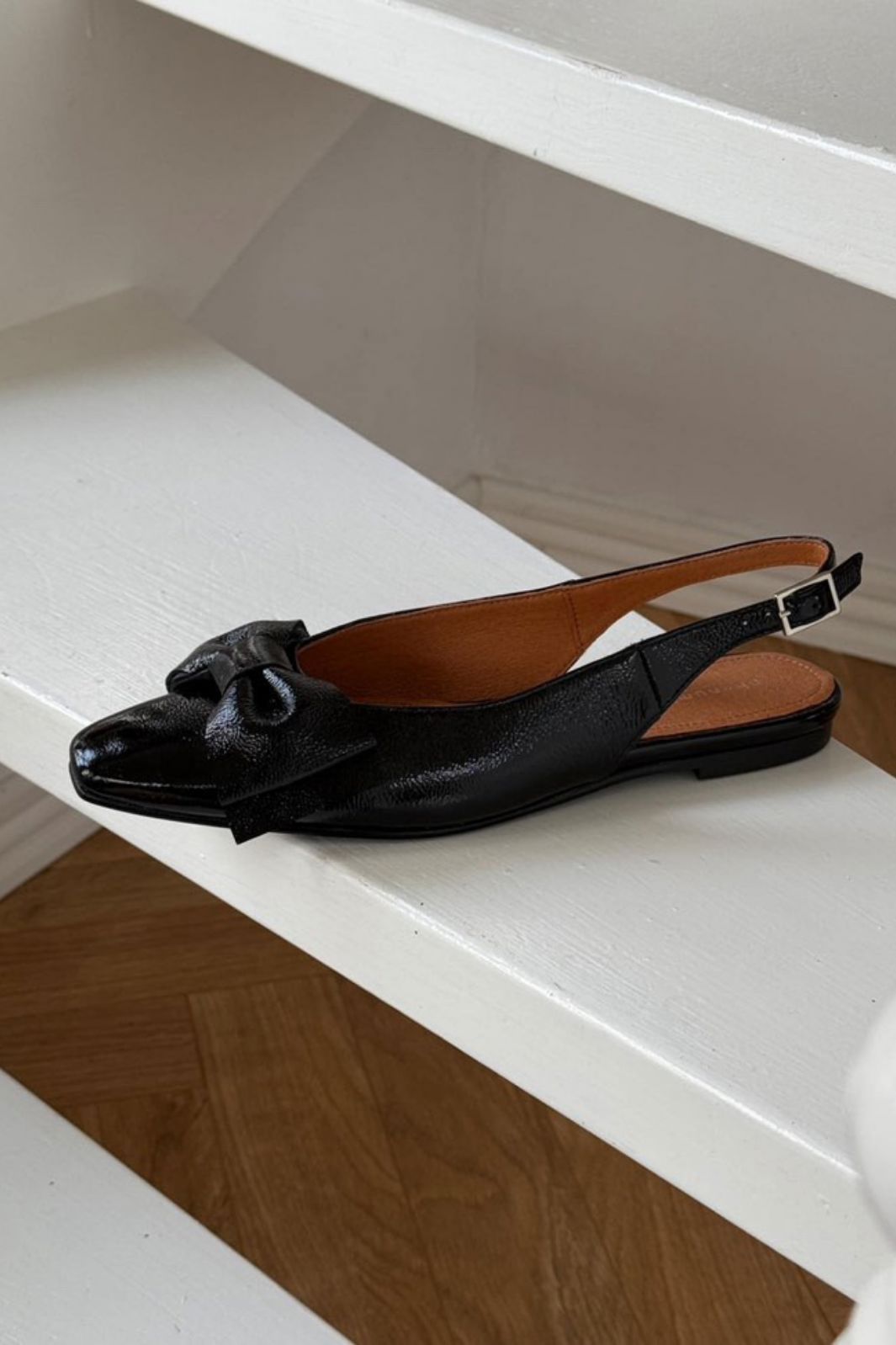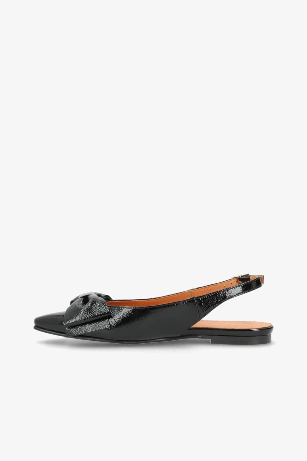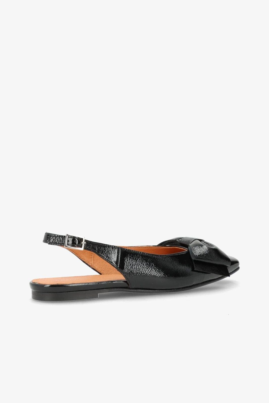 Sorte ballerina-sko fra Phenumb Copenhagen med spiss tå og sløyfe på fronten. Skoene har en skinnende laklæroverflate som gir et flott uttrykk.
