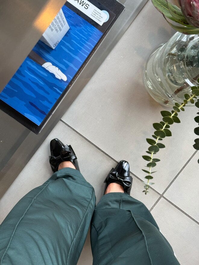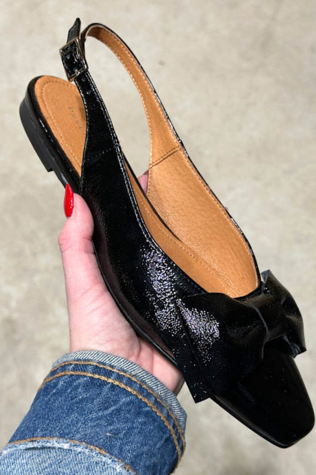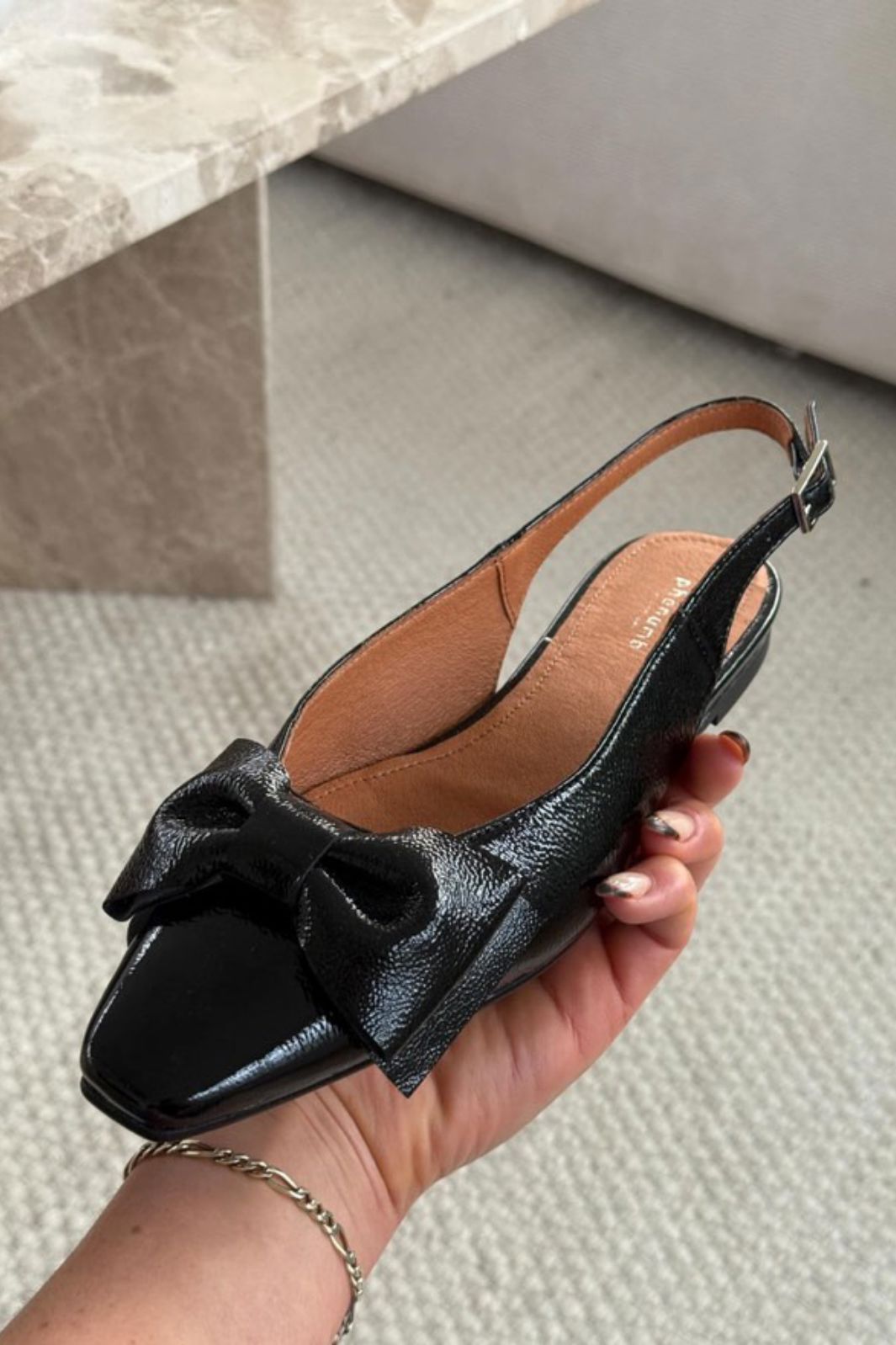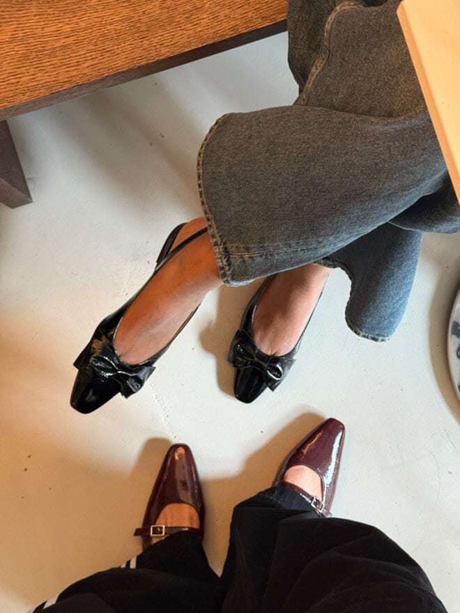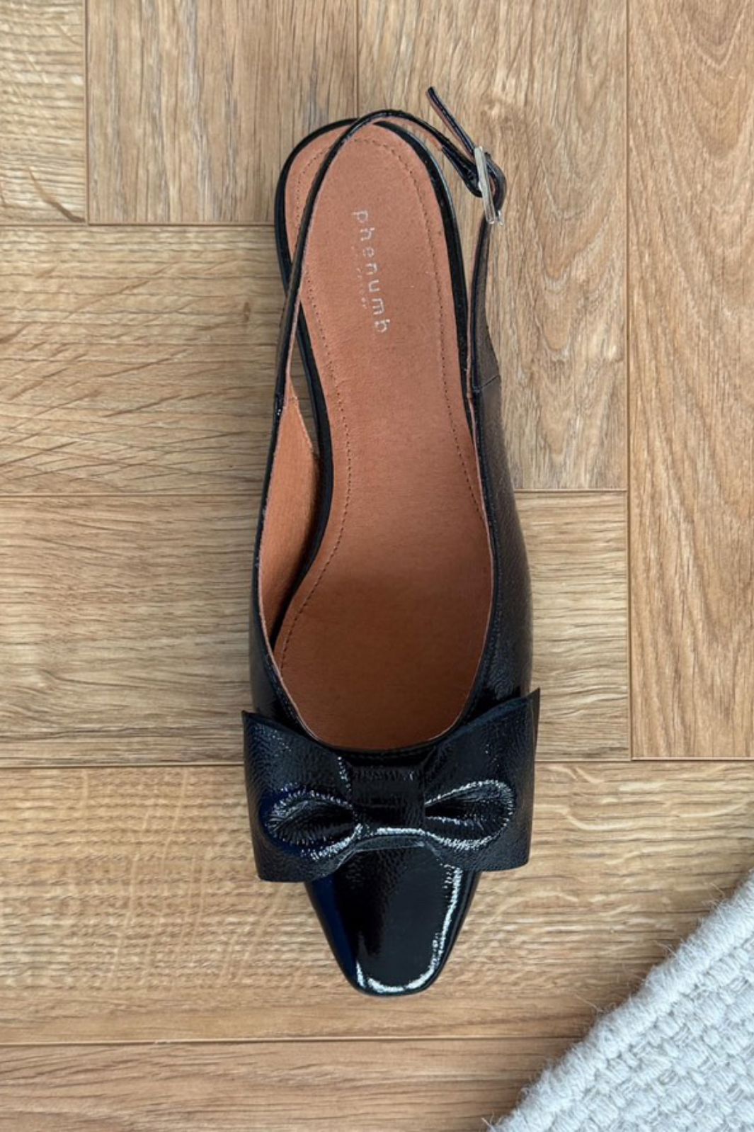 Sorte ballerina-sko fra Phenumb Copenhagen med spiss tå og sløyfe på fronten. Skoene har en skinnende laklæroverflate som gir et flott uttrykk.