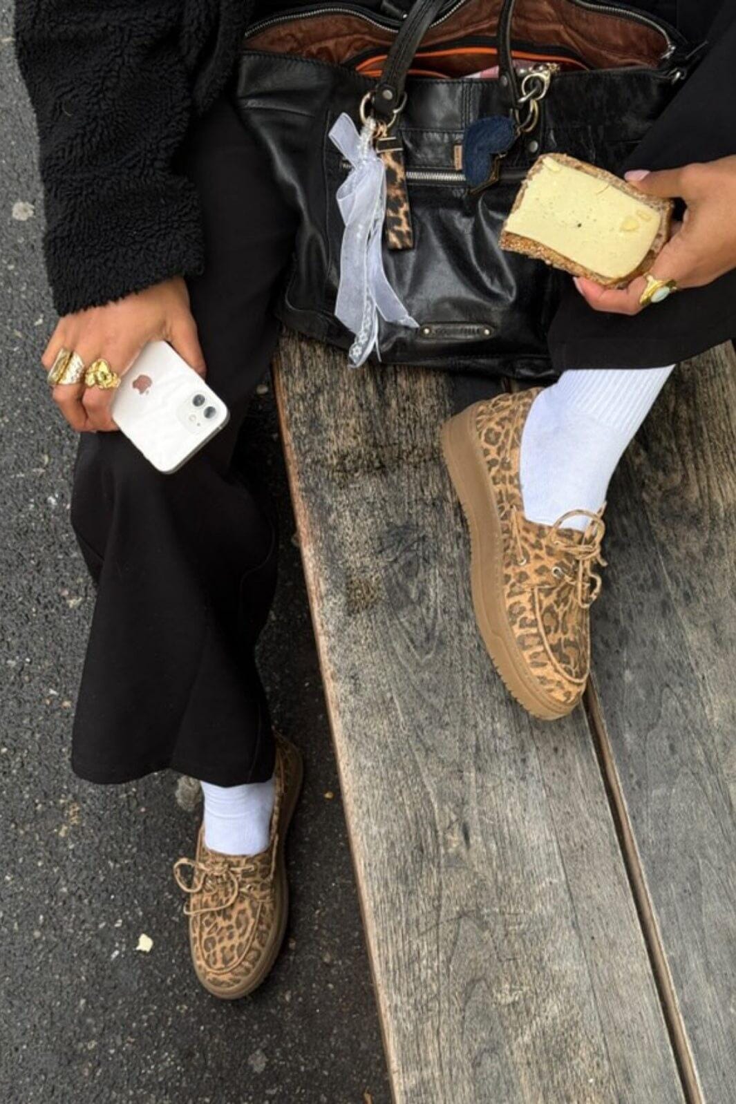 Sko i semsket skinn med et brunt leopardmønster. Skoene har en rund tå og snøring som gir en god passform.
