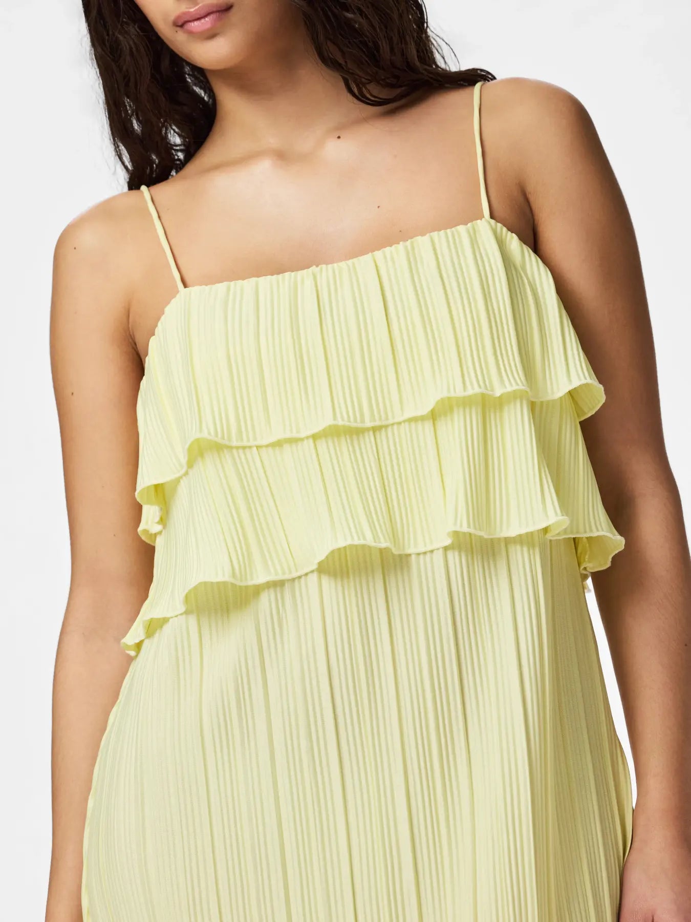 Plissert kjole fra Pieces i en lys gul nyanse. Kjolen har tynne stropper, firkantet utringning og rekker ned til anklene.