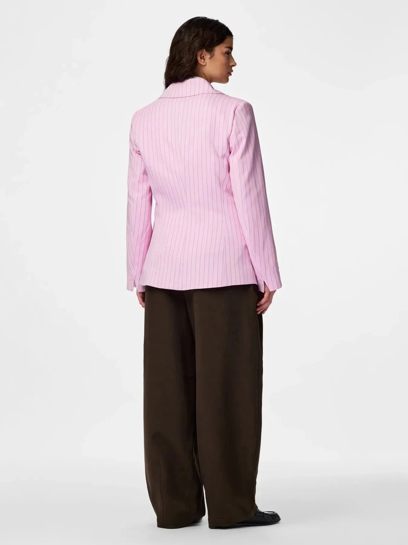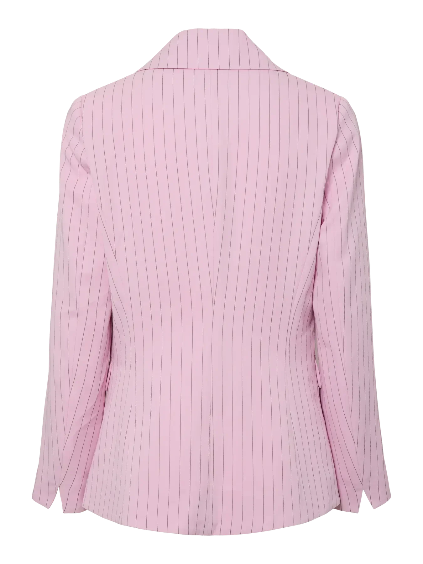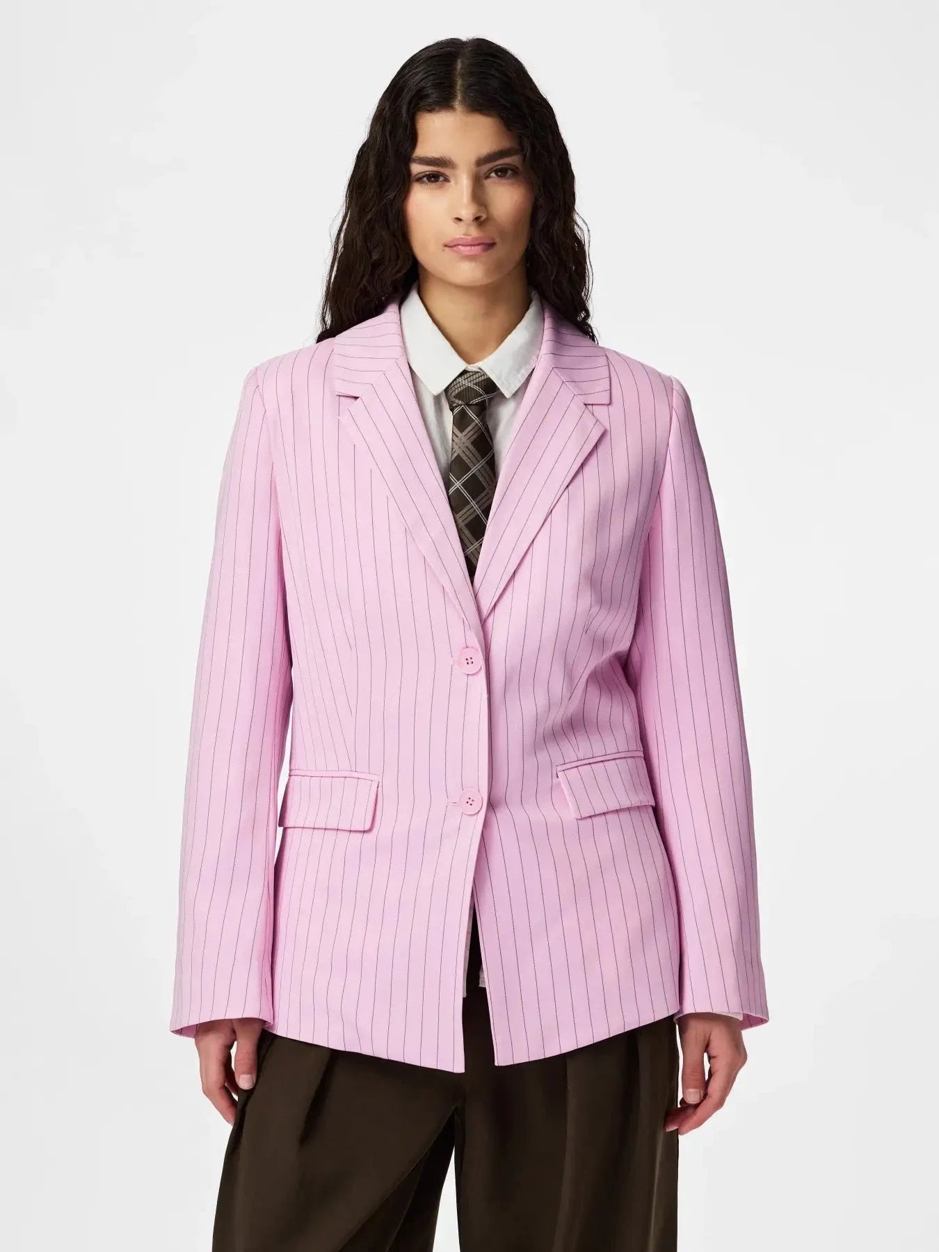 Rosa blazer fra Pieces med tynne rosa striper over hele overflaten. Laget av polyester med elastan og en silkemyk overflate.