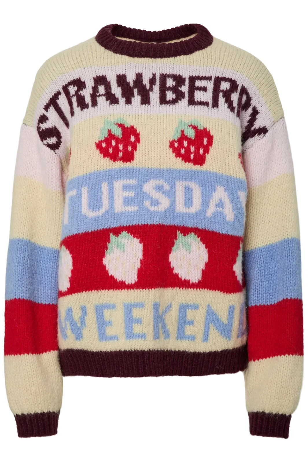 En flerfarget strikkegenser fra Pieces med grafiske elementer og tekst. Genseren har en beige base med striper i rødt, blått og brunt.