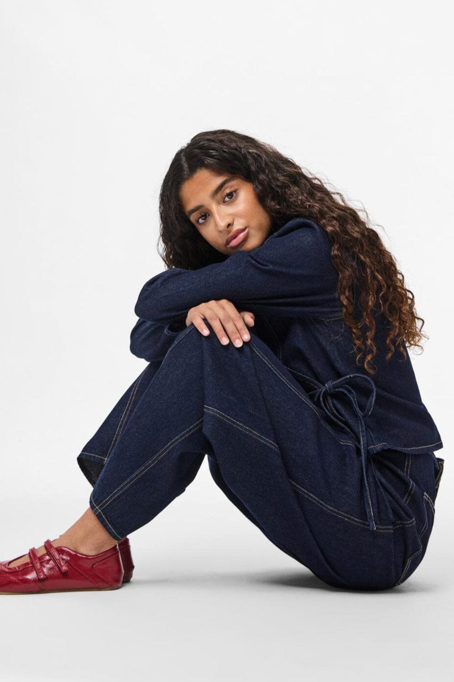 Denimskjorte fra Pieces i mørkeblå denim med v-hals og knytebånd i midjen. Skjorten har kontrasterende sømmer og en omslagslukking med knytebåndsdetaljer.