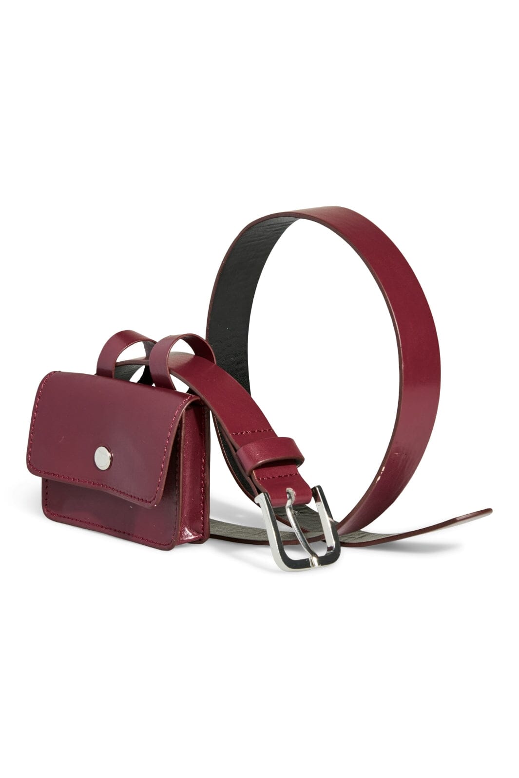 Bordeauxfarget belteveske fra Pieces med en praktisk liten veske festet til beltet. Den integrerte vesken har plass til småting og lukkes med trykknapp.