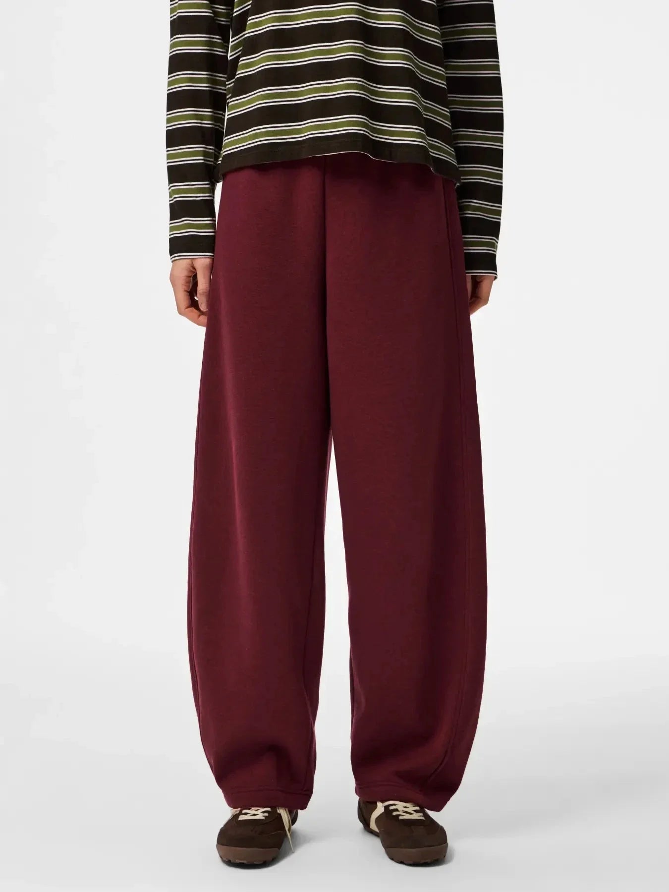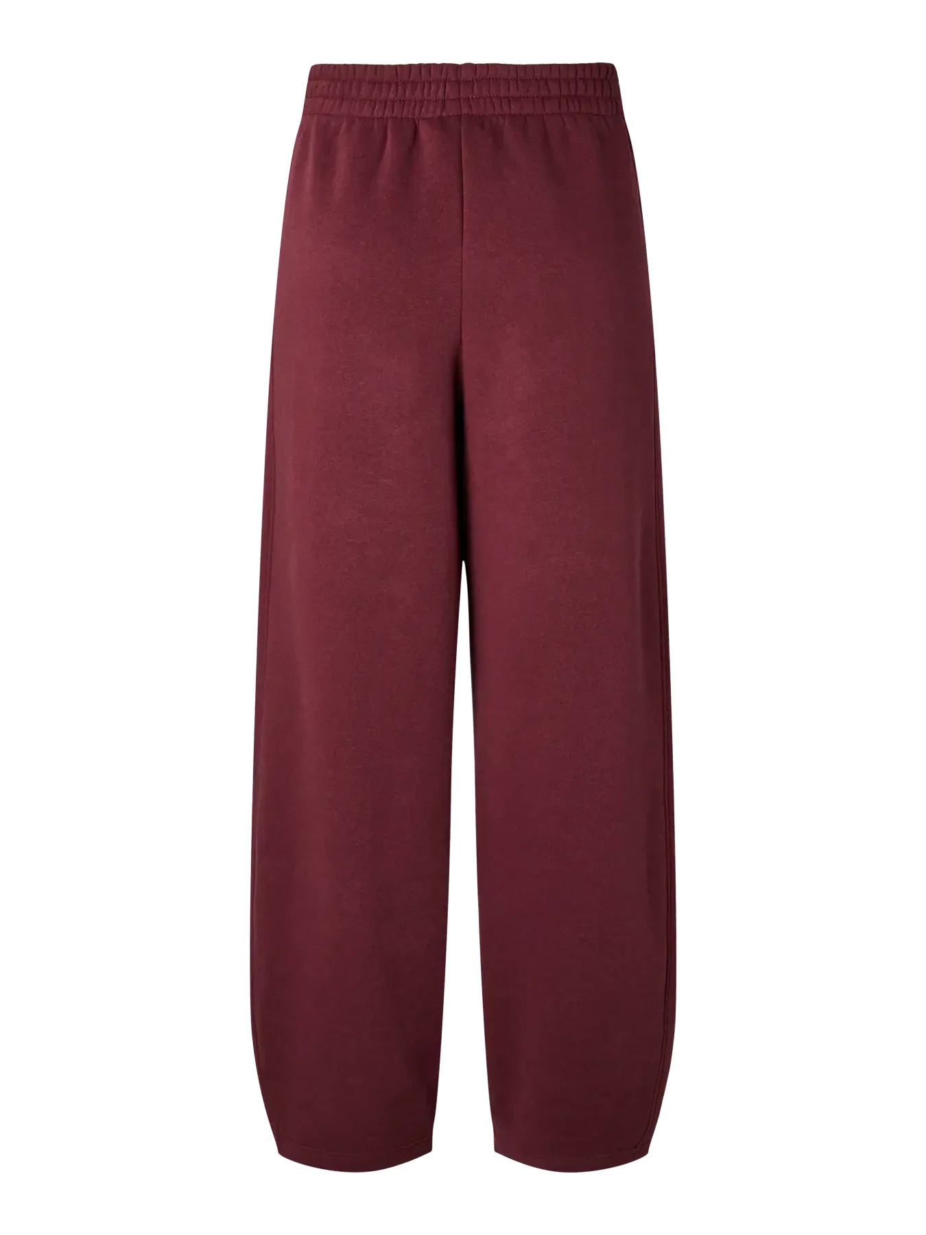 Barrel-bukser fra Pieces i en dyp rødbrun farge. Buksene har en løs passform med bred benstil og elastisk linning.