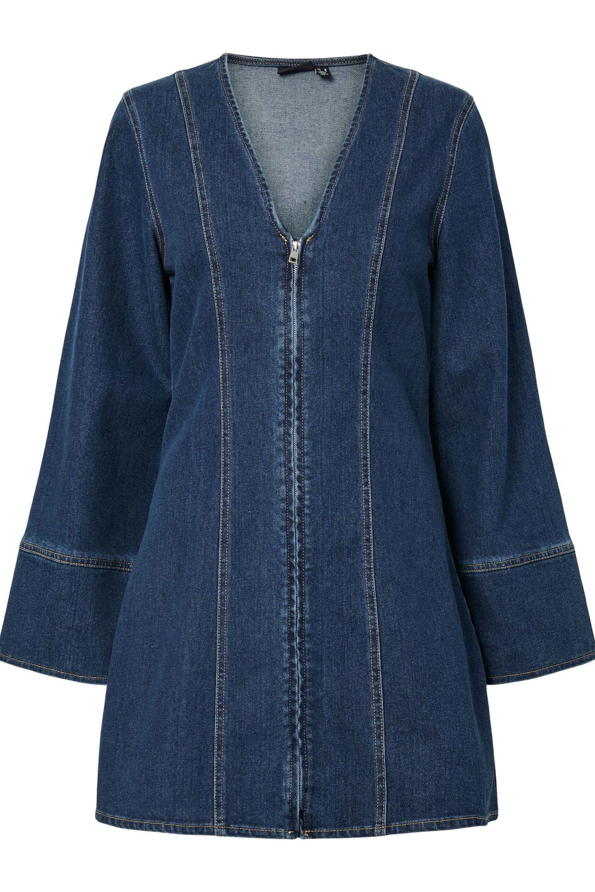 Denimkjole fra Pieces i mørkeblå denim med lange ermer og rund hals. Kjolen har en regular fit og går til midt på låret. De dekorative sømmene gir kjolen et rustikt uttrykk.