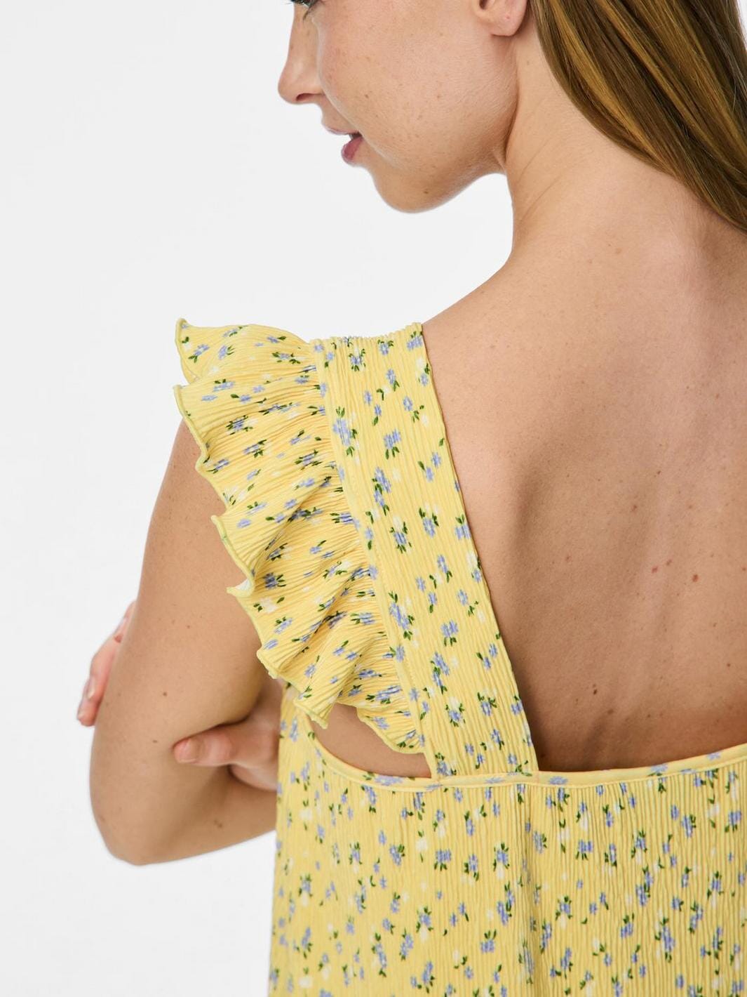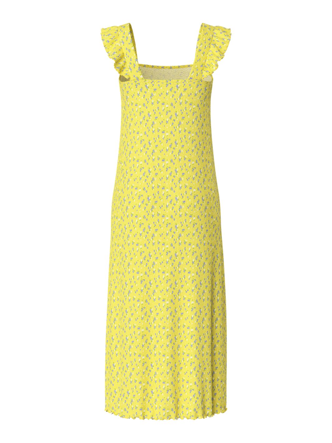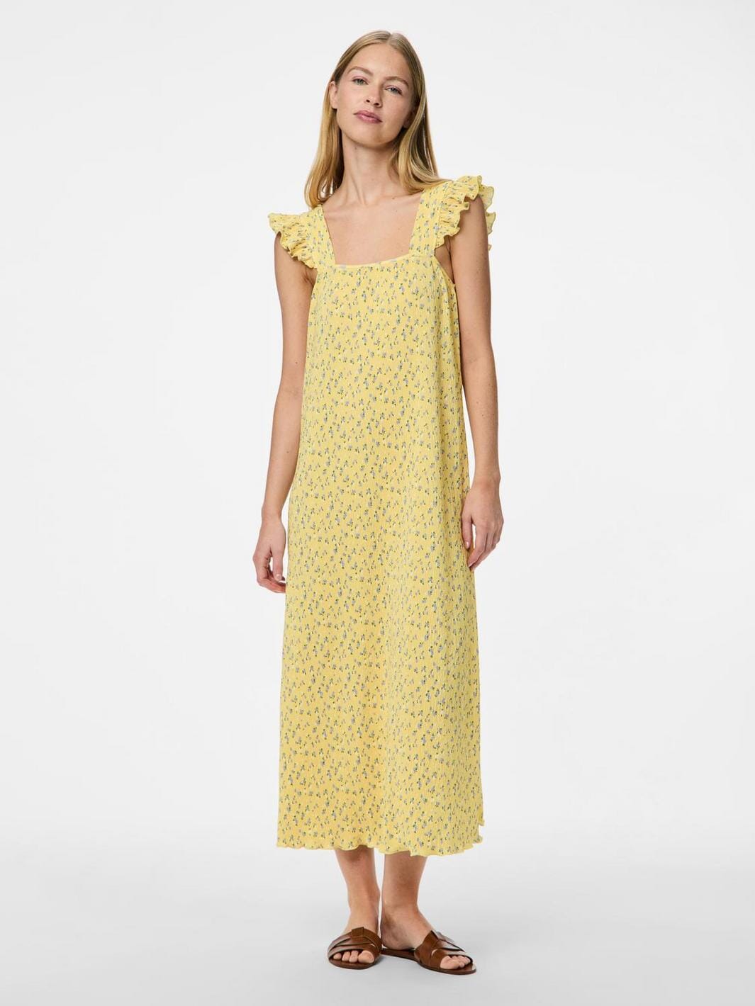 Sommerkjole fra Pieces i lys gul med små blå og hvite blomster. Kjolen har en firkantet halsutskjæring, volangdetaljer og en løs passform.