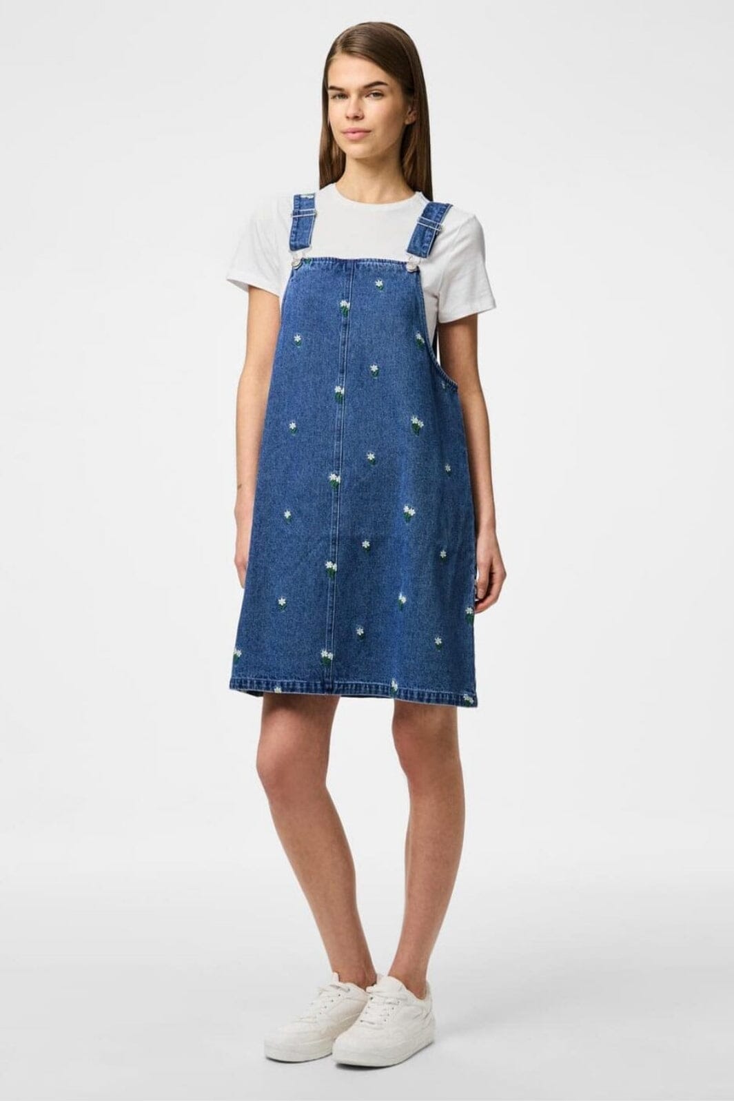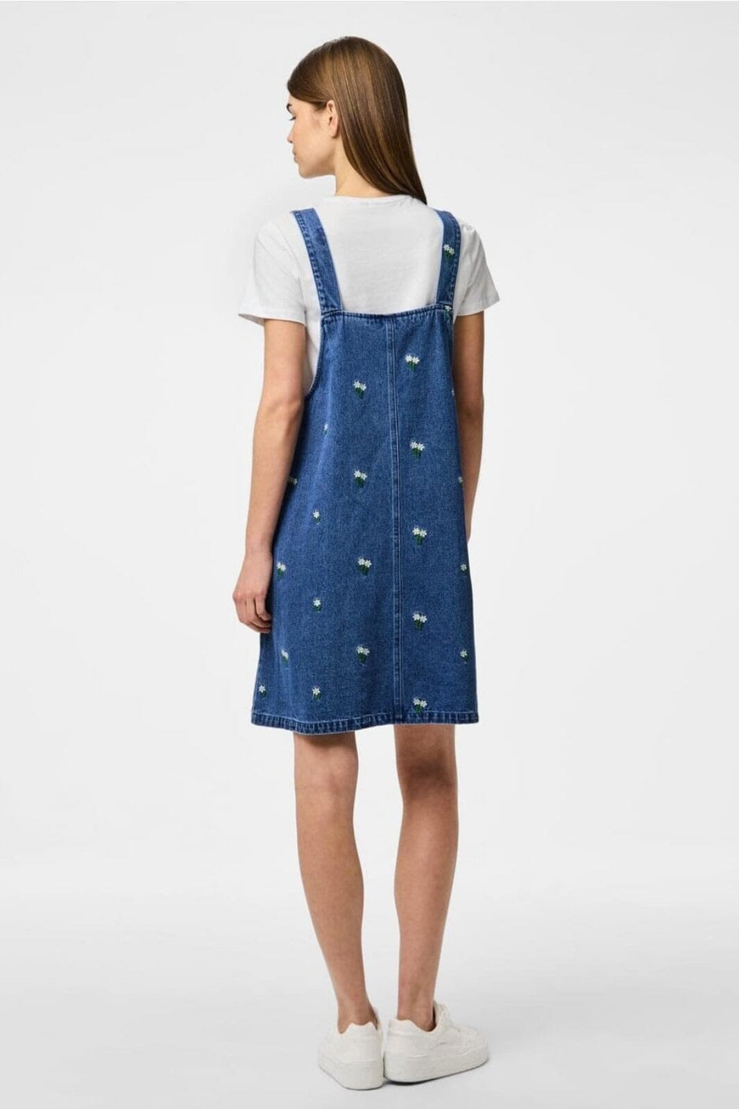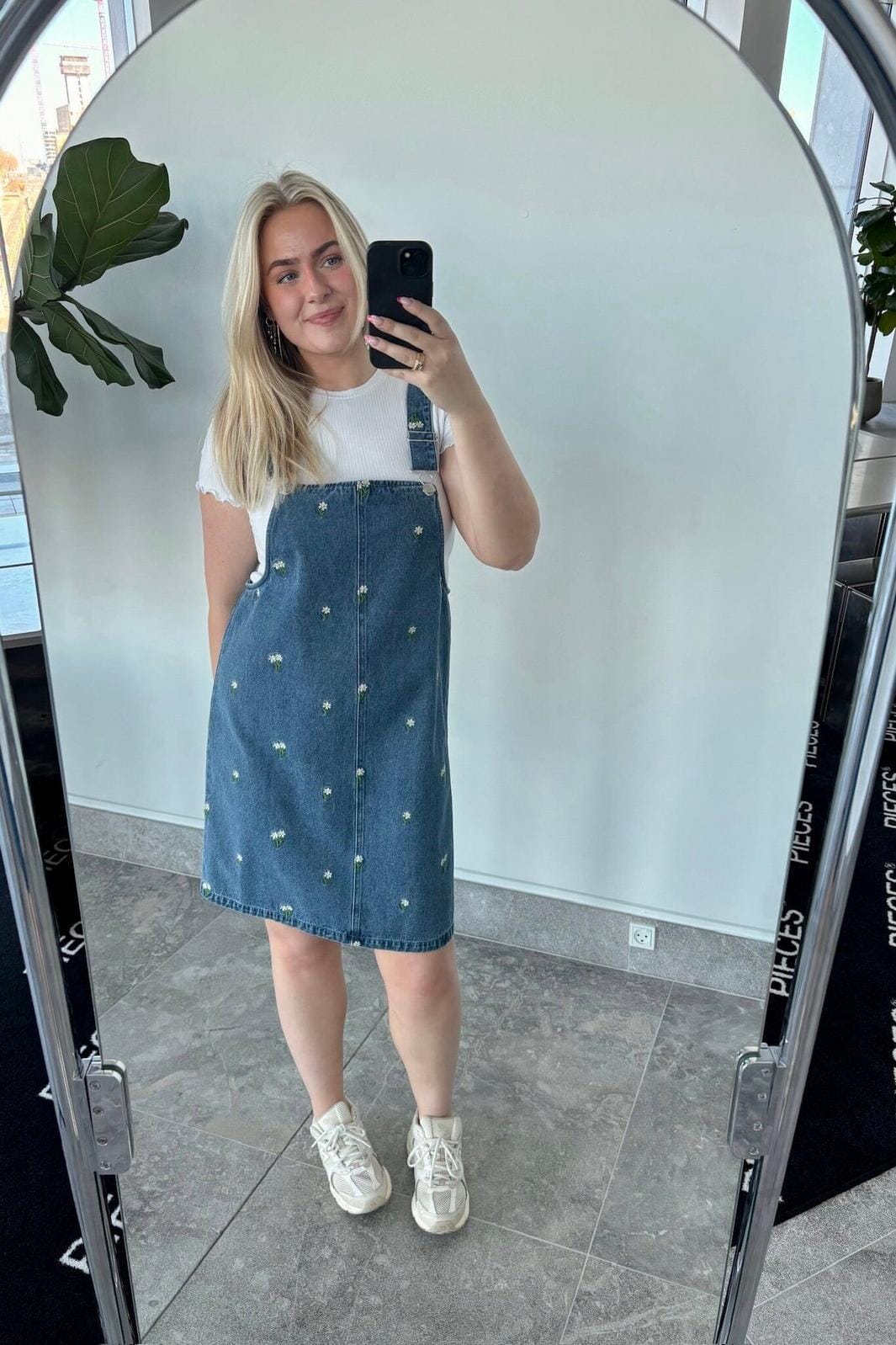 Denimkjole fra Pieces i mellomblå denim med små blomsterbroderier. Kjolen har en rund halsutskjæring og et ermeløst design som gir den et lett uttrykk.