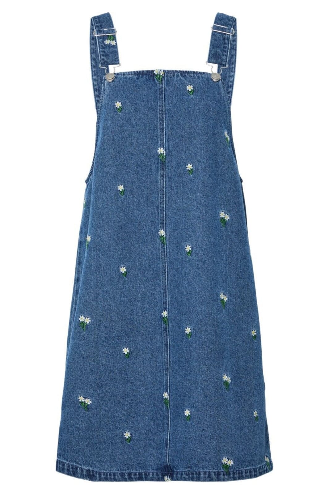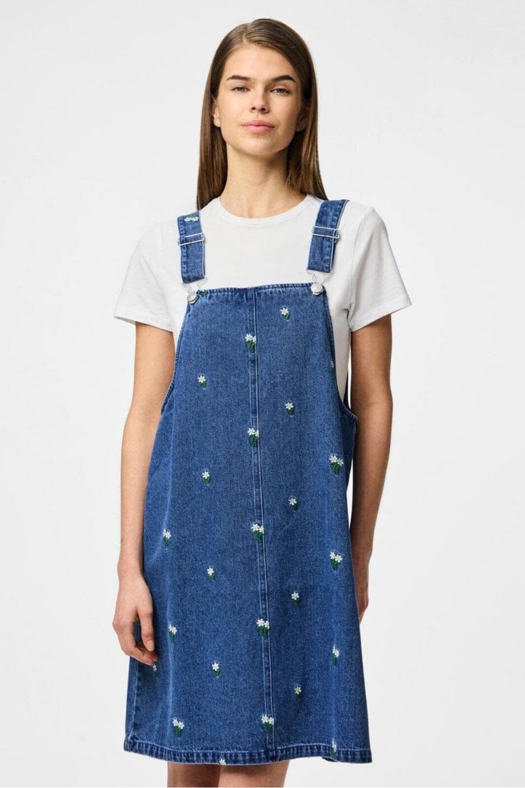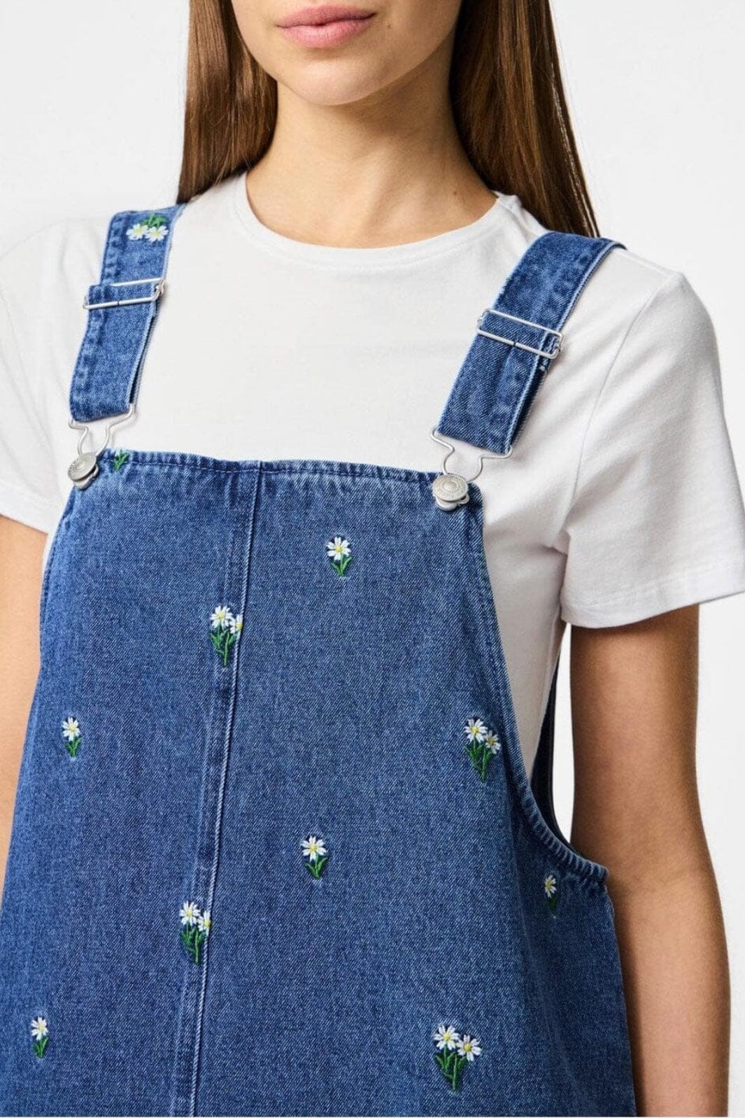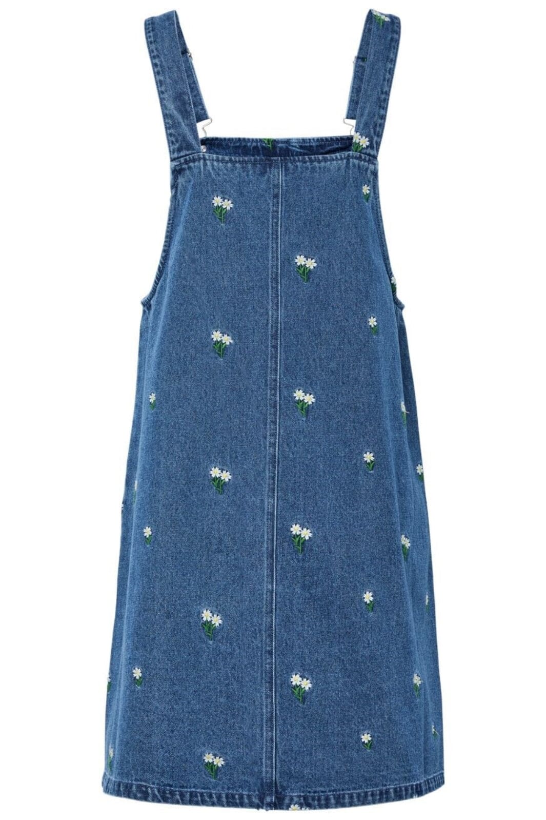 Denimkjole fra Pieces i mellomblå denim med små blomsterbroderier. Kjolen har en rund halsutskjæring og et ermeløst design som gir den et lett uttrykk.