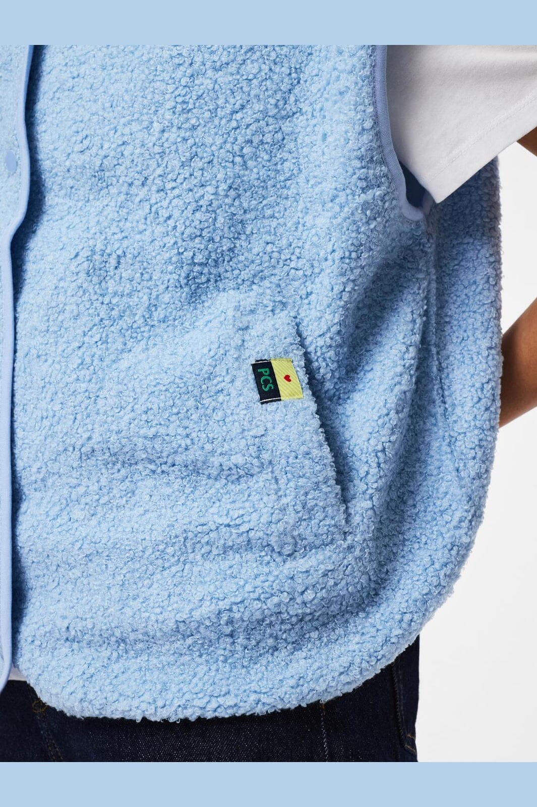 Lys blå teddyvest fra Pieces, laget av 100 % resirkulert polyester med en myk overflate. Vesten har V-hals og trykknapplukking.