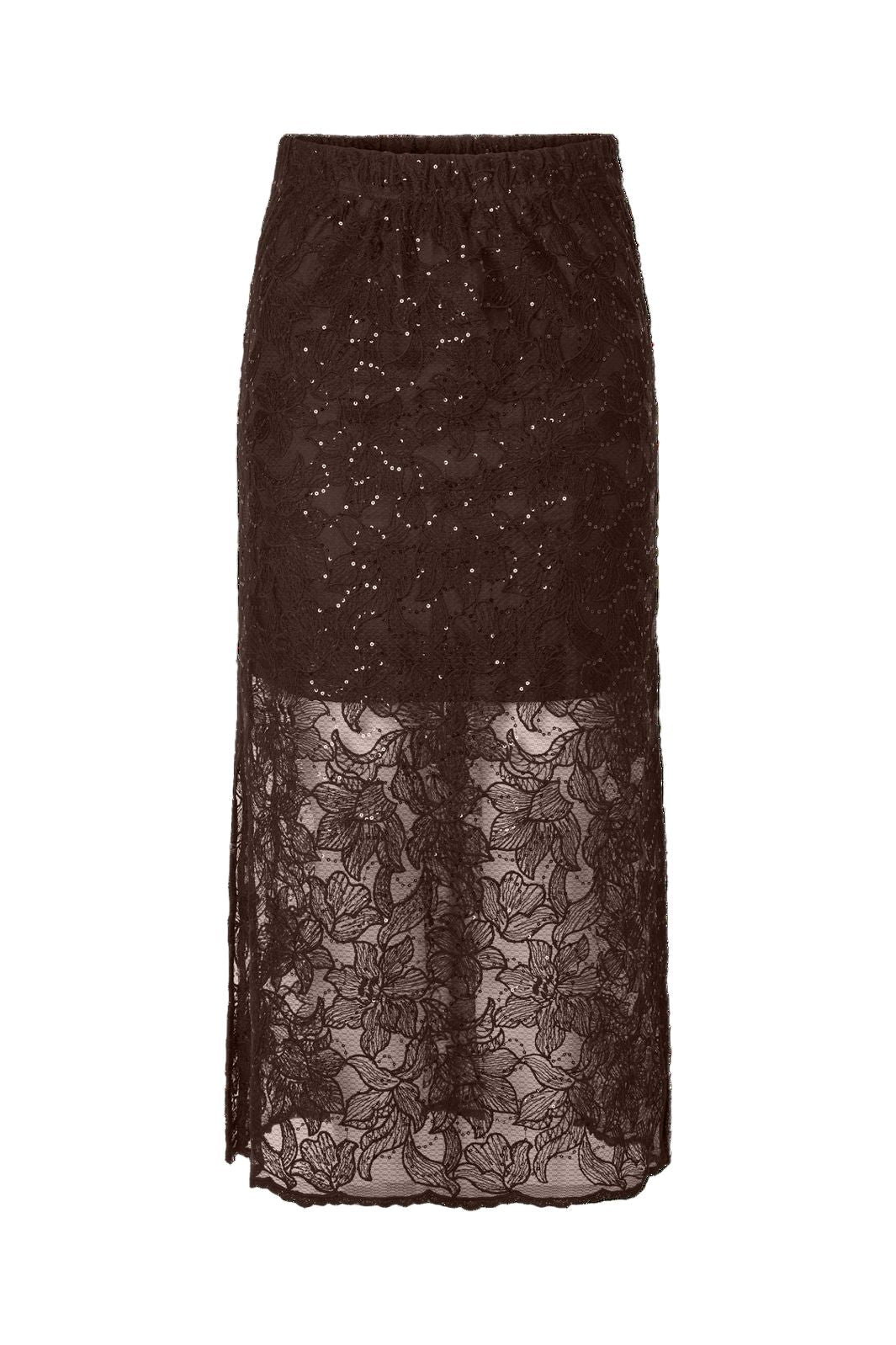 Skjørt fra Pieces i brunt med små, skinnende paljetter og gjennomsiktig blondekant nederst. Det blomstrete mønsteret gir skjørtet et feminint uttrykk.