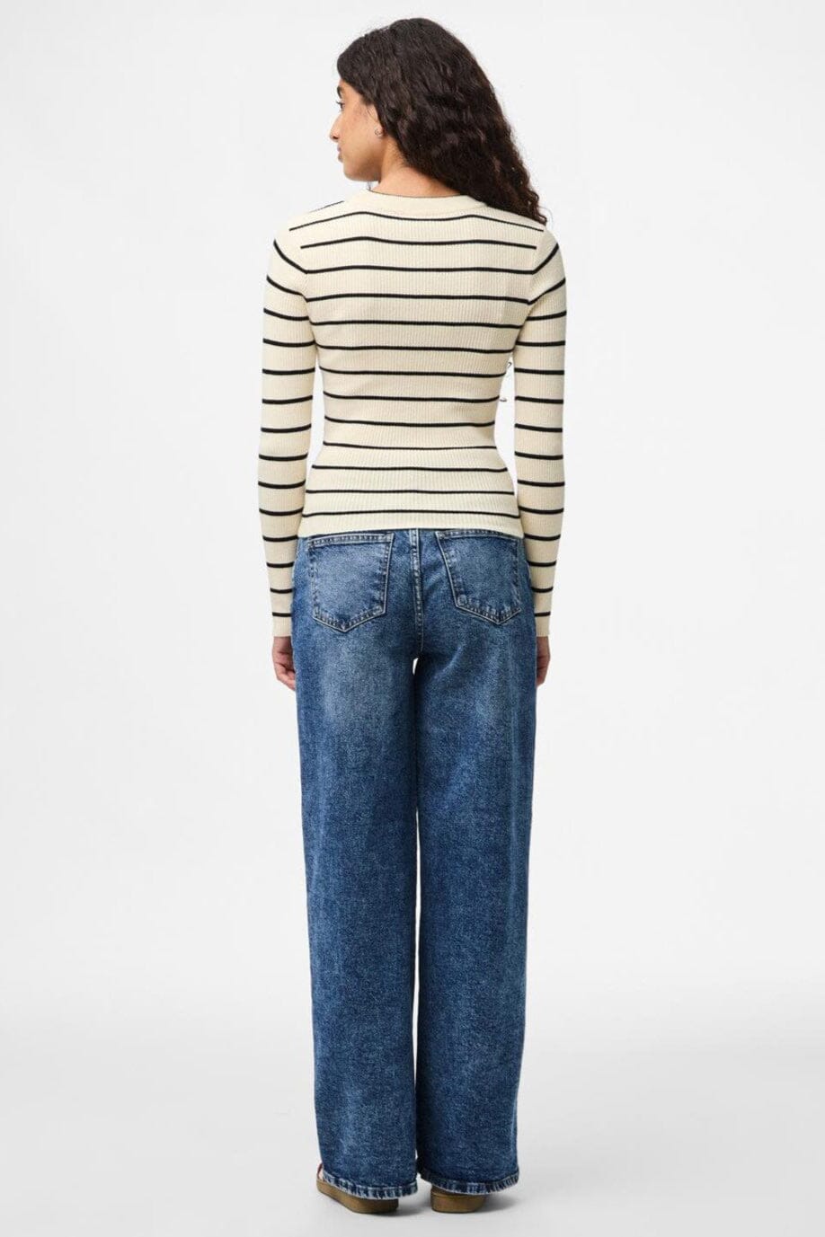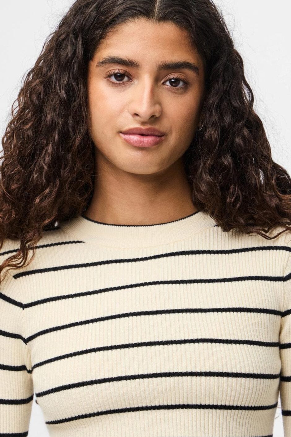 Stripet strikkegenser fra Pieces med rund hals. Den lyse bjørkefargen har smale sorte striper, og strikken har en tettsittende passform med ribbet tekstur.