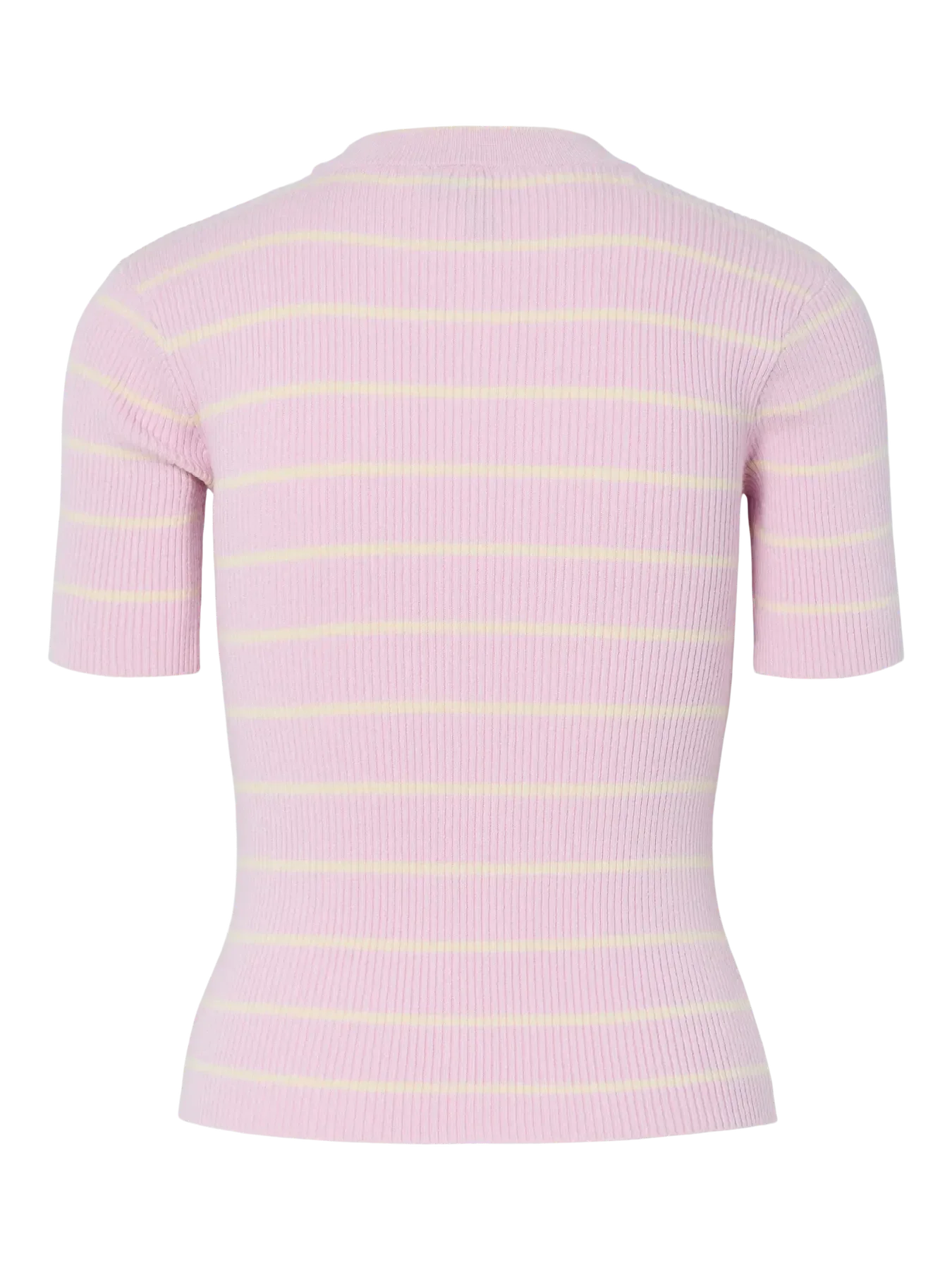 Strikket topp fra Pieces i lyse lilla med rosa striper. Toppen har korte ermer, en rund halsutringning og en tettsittende passform.