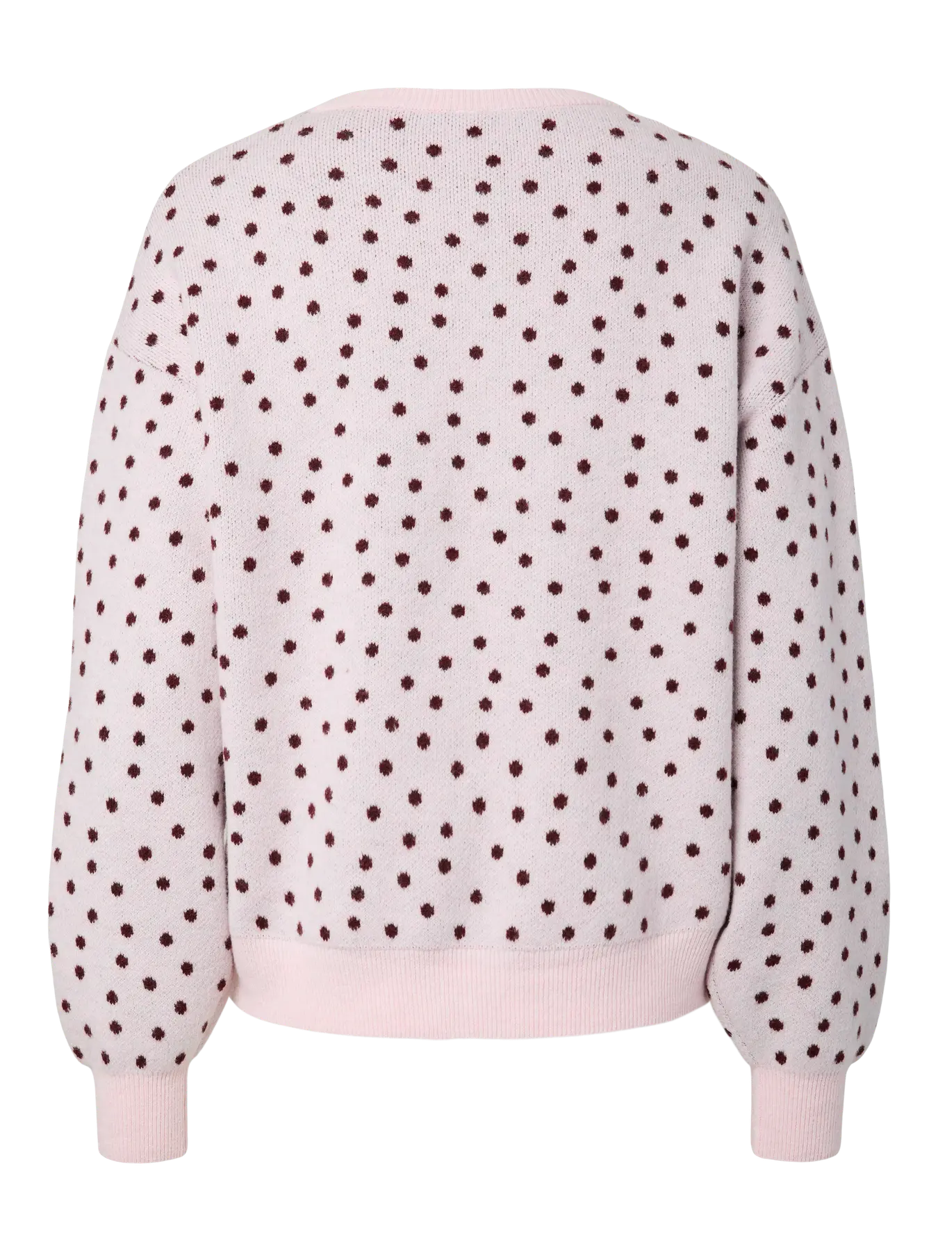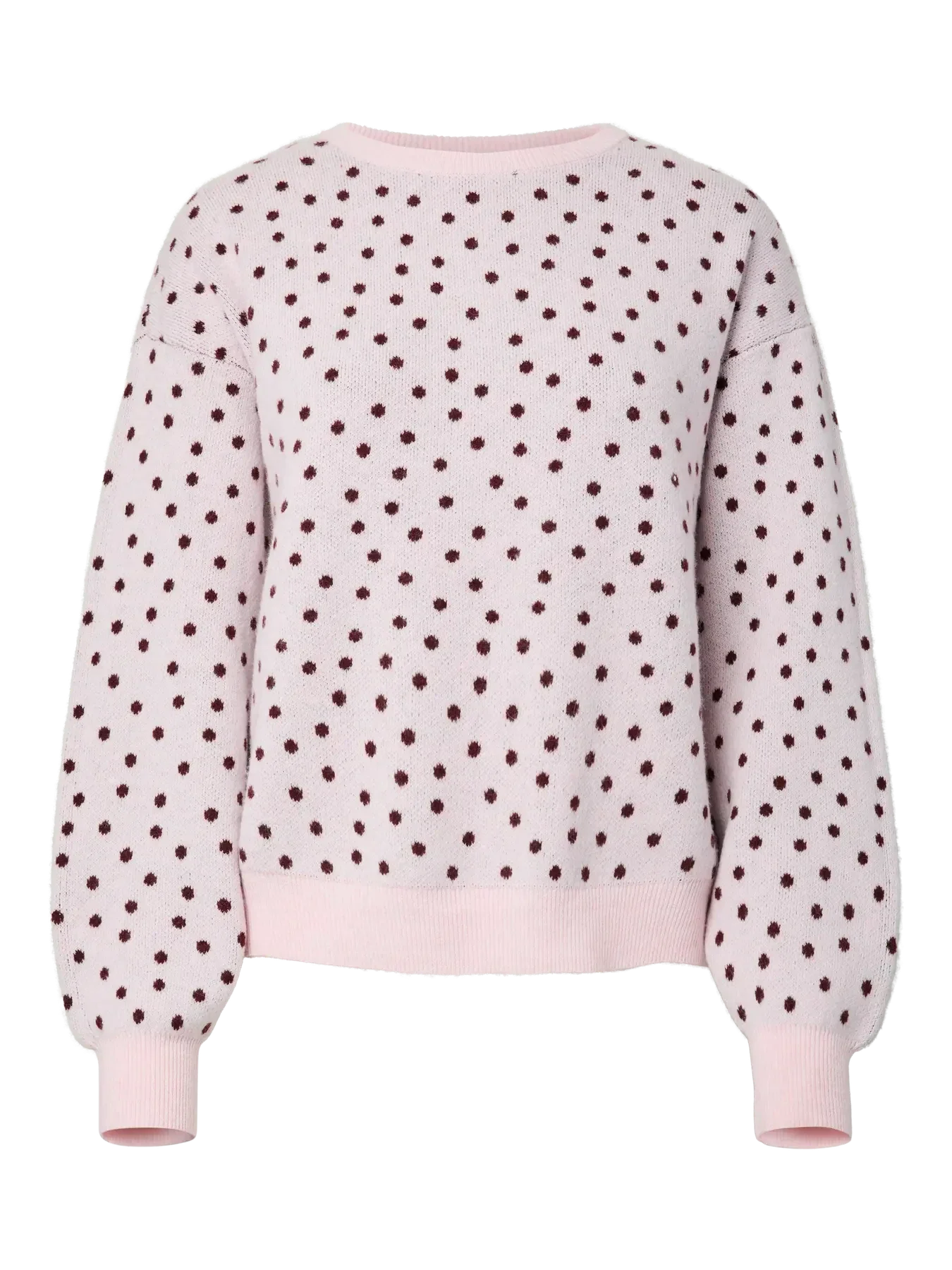 Strikkegenser fra Pieces i rosa med mørkerøde prikker. Genseren har en rund halsutringning og ribbekanter ved håndleddene og nederst.