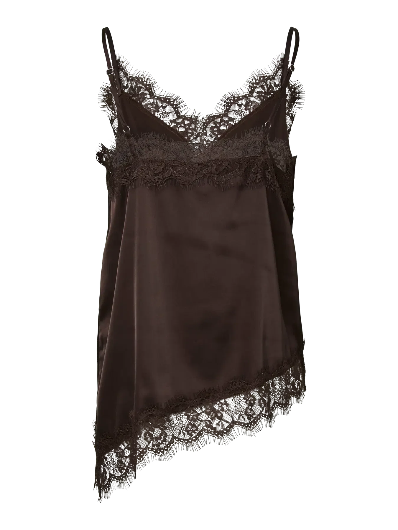 Brun satintopp fra Pieces med blondedetaljer. Toppen har justerbare spaghettistropper og en asymmetrisk kant som gir den et feminint uttrykk.