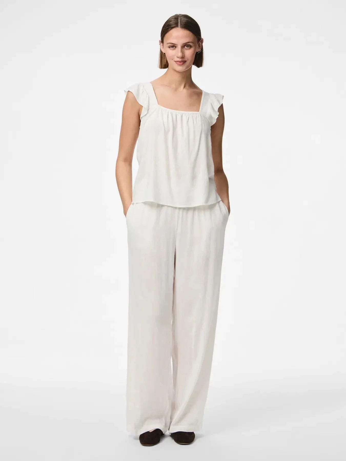 Hvit topp fra Pieces med volangerm og firkantet halsutskjæring. Toppen har en regular fit og er laget av en blanding av viskose og lin, noe som gir et lett og luftig uttrykk.