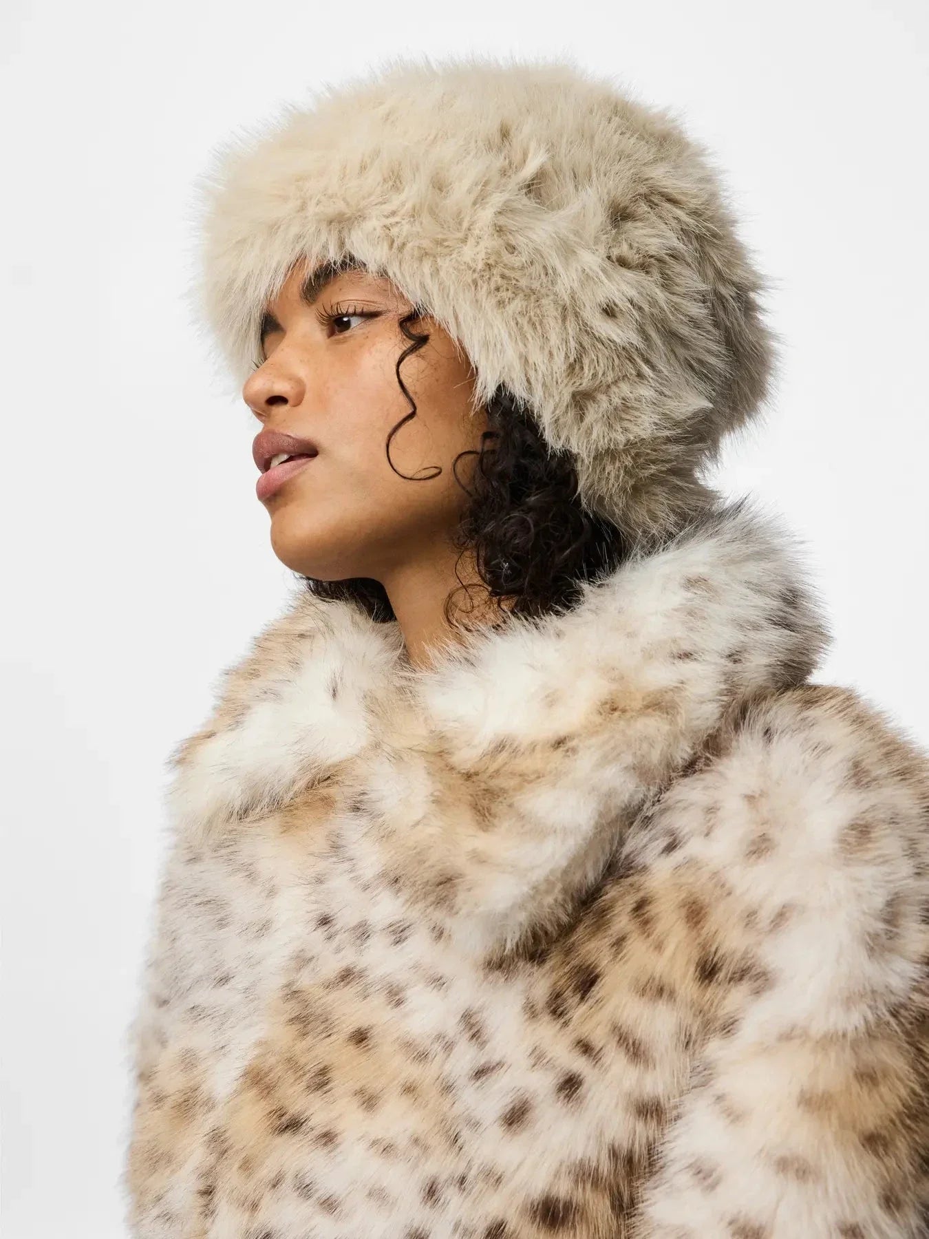 En fluffy hatt fra Pieces i lys beige. Hatten har et voluminøst design med en rund form som dekker hele hodet.