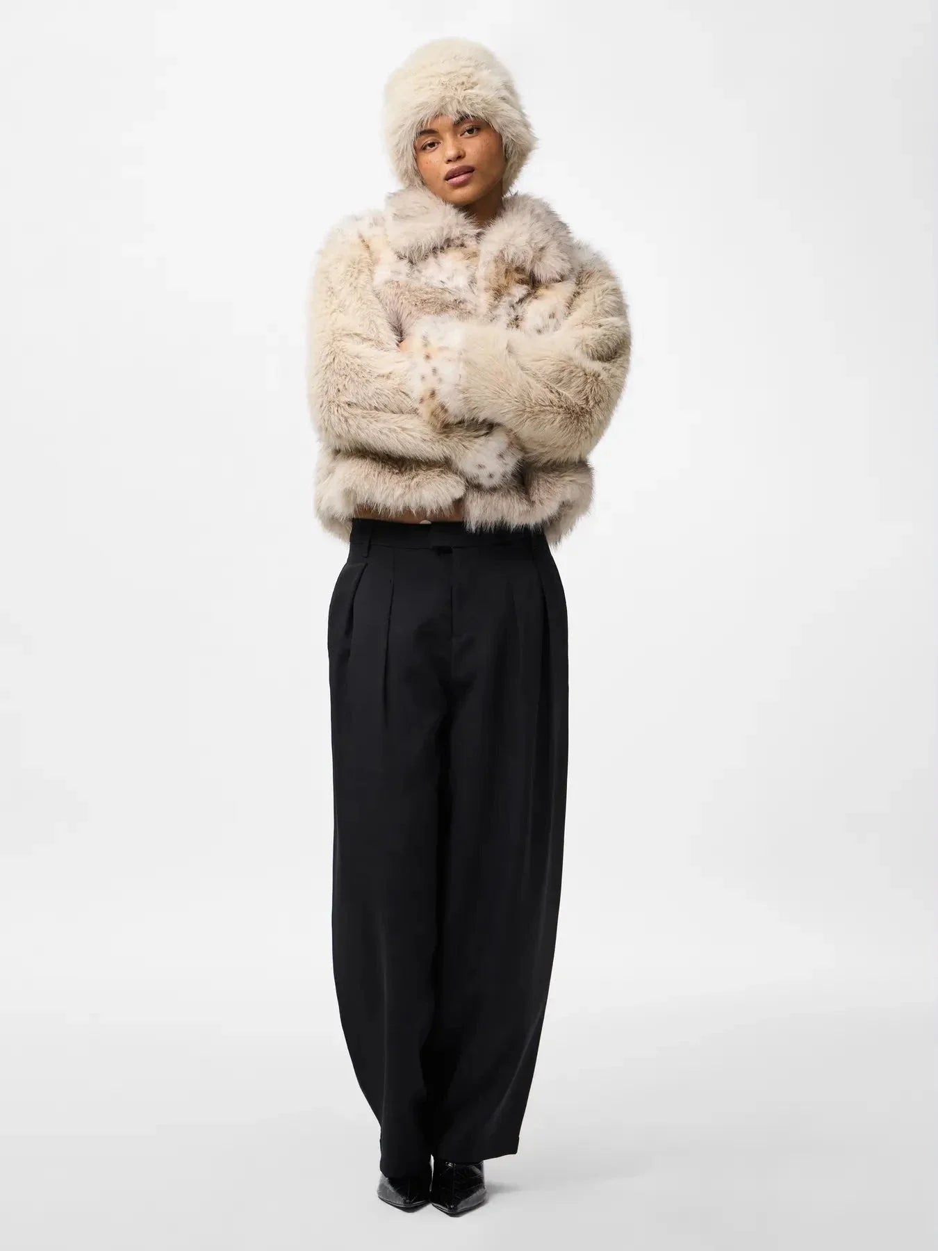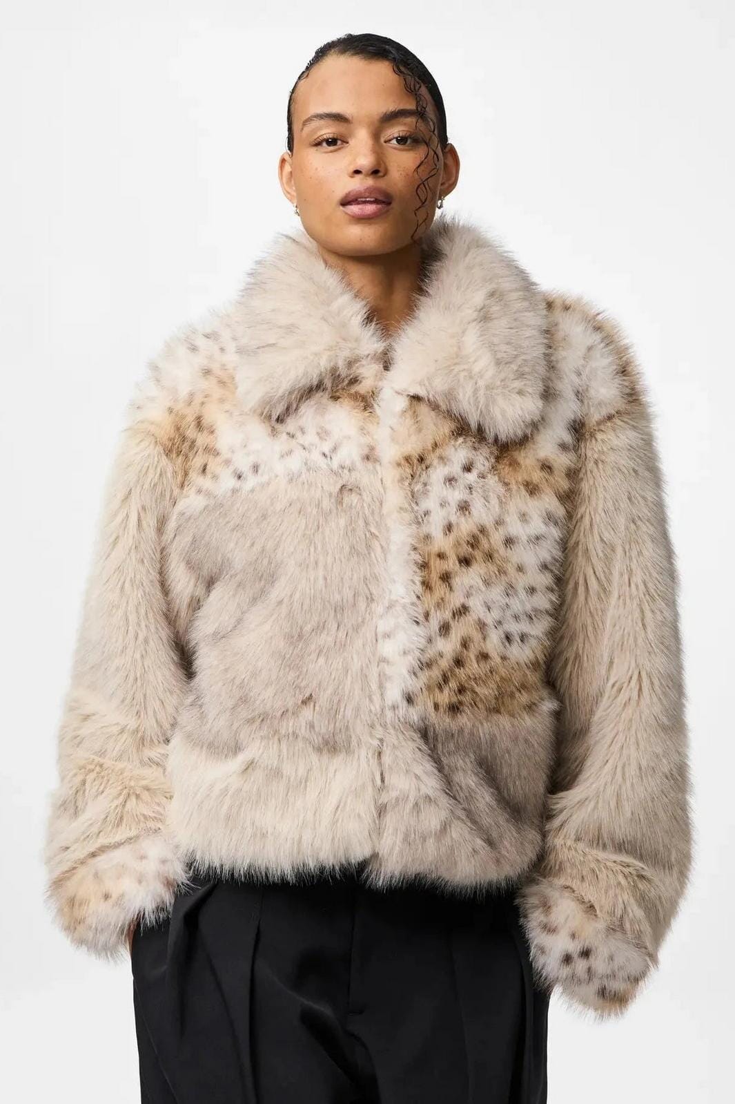Kort, fluffy jakke fra Pieces, laget av 100% polyester i et grått patchwork-design. Jakken har skjortekrage, lange ermer og en løs passform.