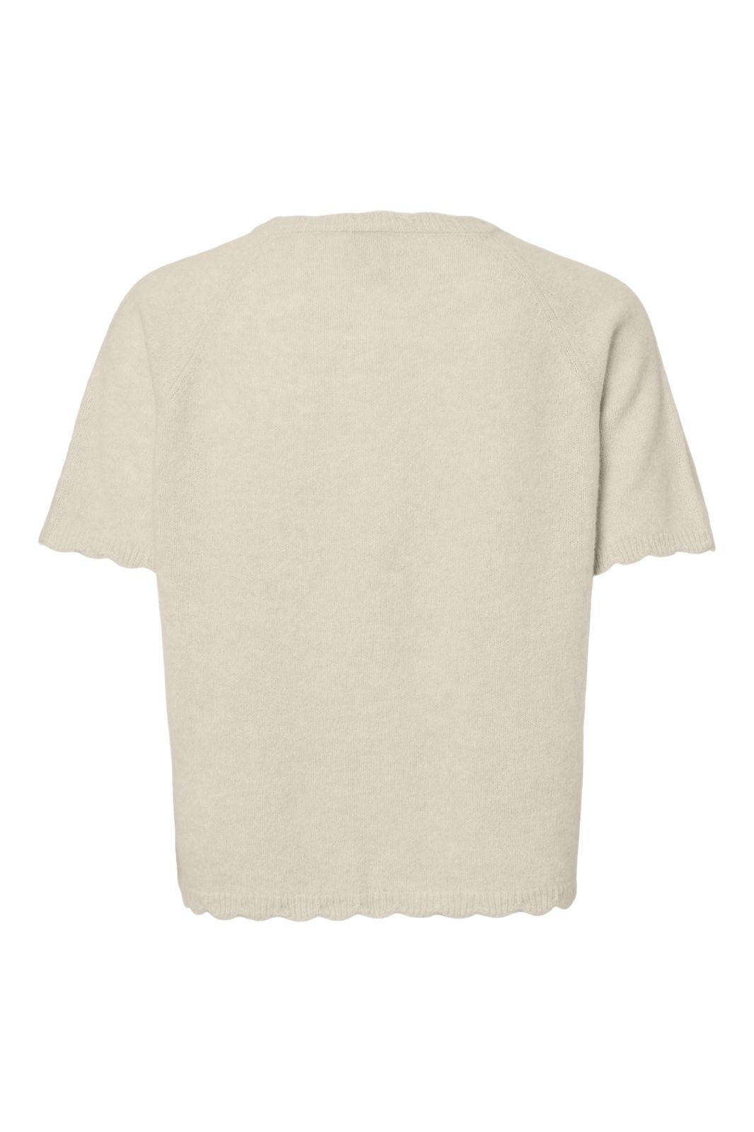 Beige kortermet cardigan fra Pieces med rund hals og knappelukking. Den bølgede kanten langs ermene og nederst gir cardiganen et mykt uttrykk.