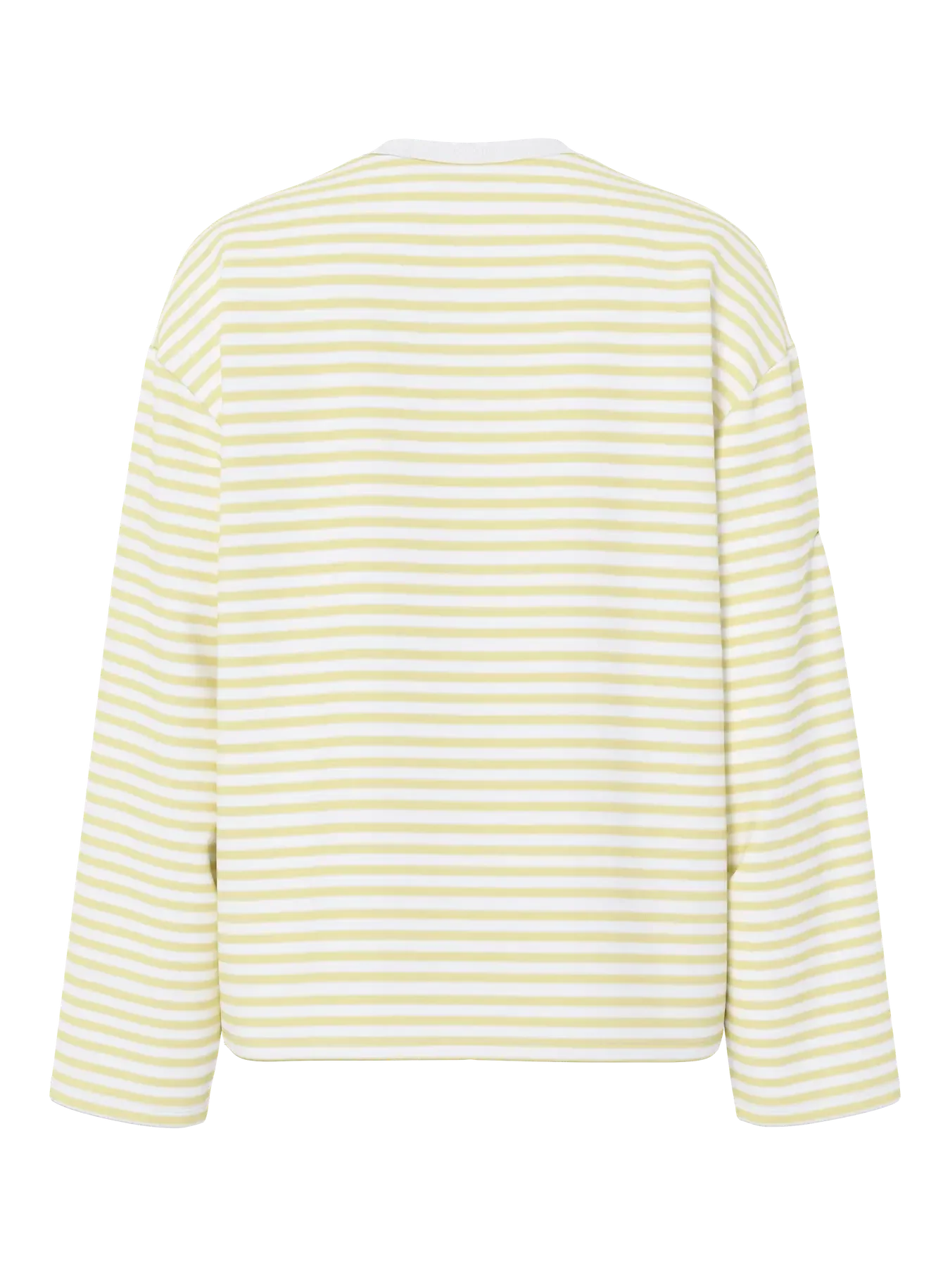 Stribet langermet topp fra Pieces i hvit og lysegul. Den har en oversized passform og en rund halsutringning.