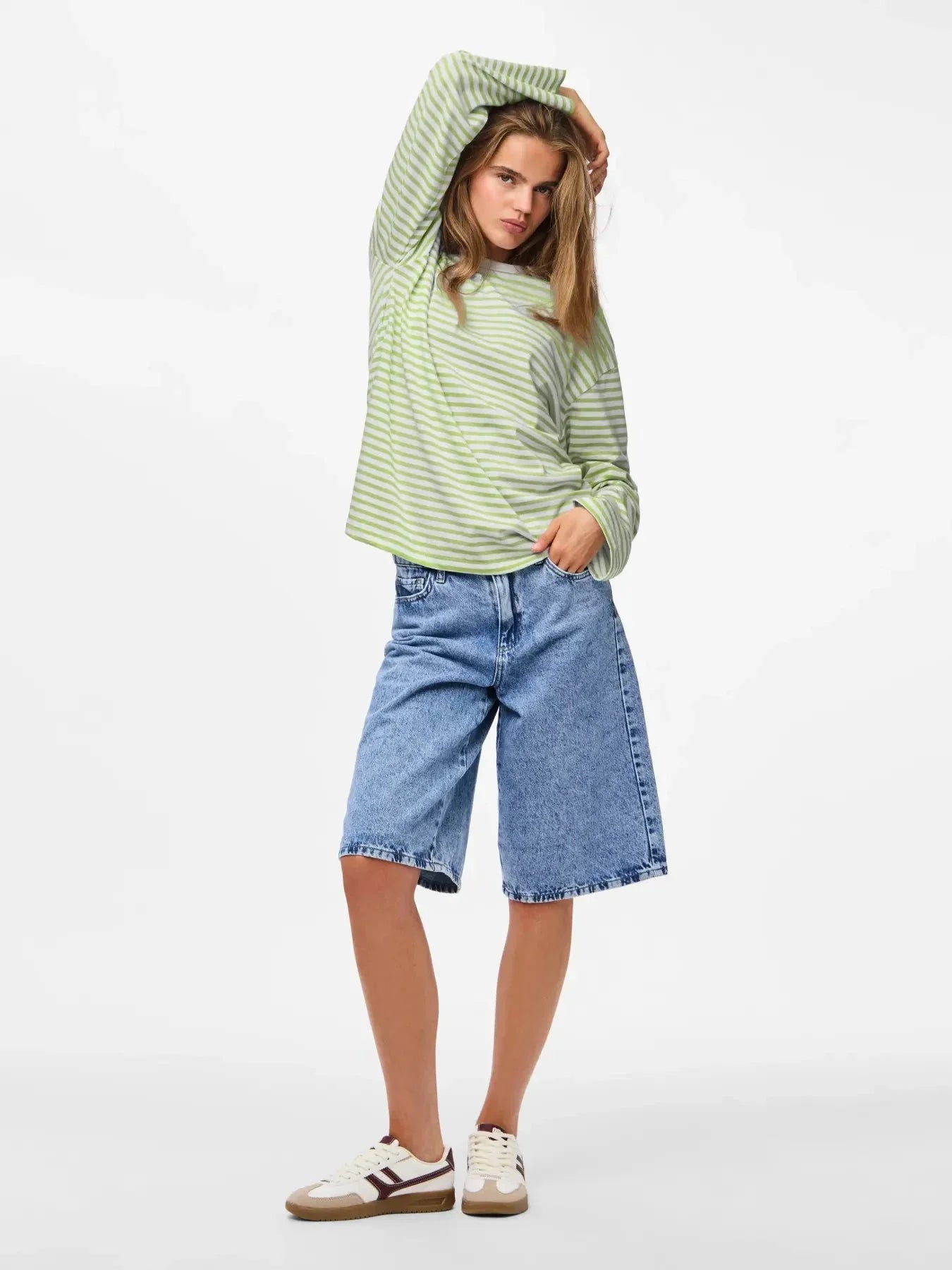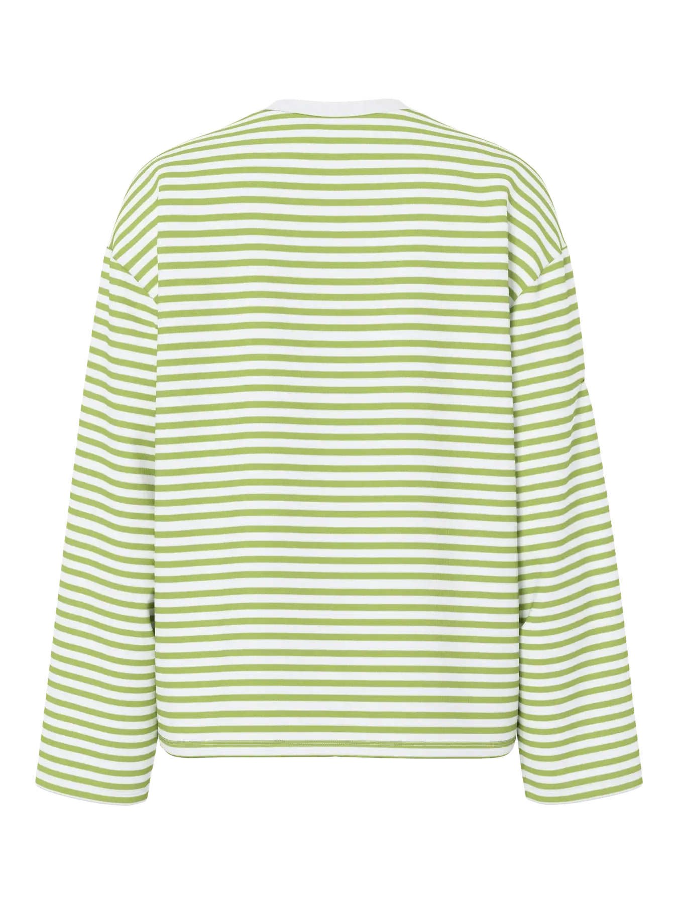 Langermet topp fra Pieces med grønne og hvite striper. Toppen har en rund halsutringning med hvit kant og en oversized passform.