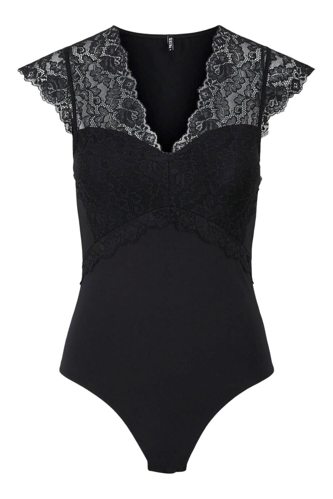 Svart bodystocking fra Pieces med blondedetaljer på skuldrene og ermene. V-halsutskjæring og tettsittende passform gir en flott silhuett.