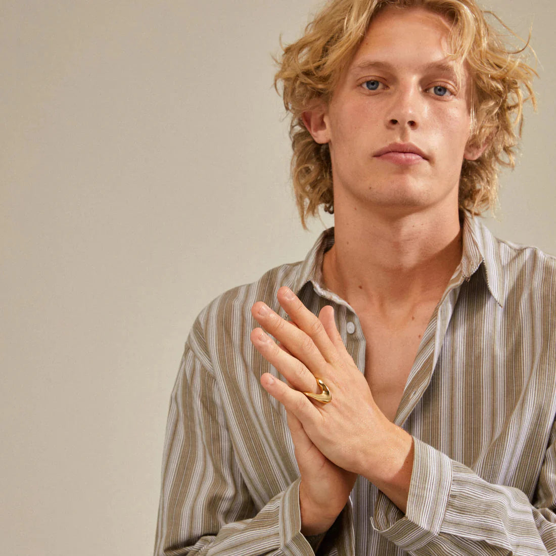 Gullbelagt ring fra Pilgrim med buet design. Ringen har en glatt overflate og en bølgende form som gir den et skulpturelt uttrykk.
