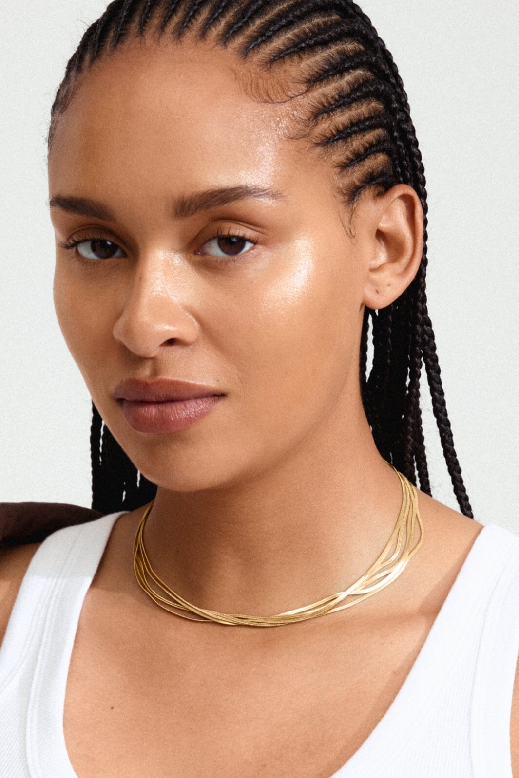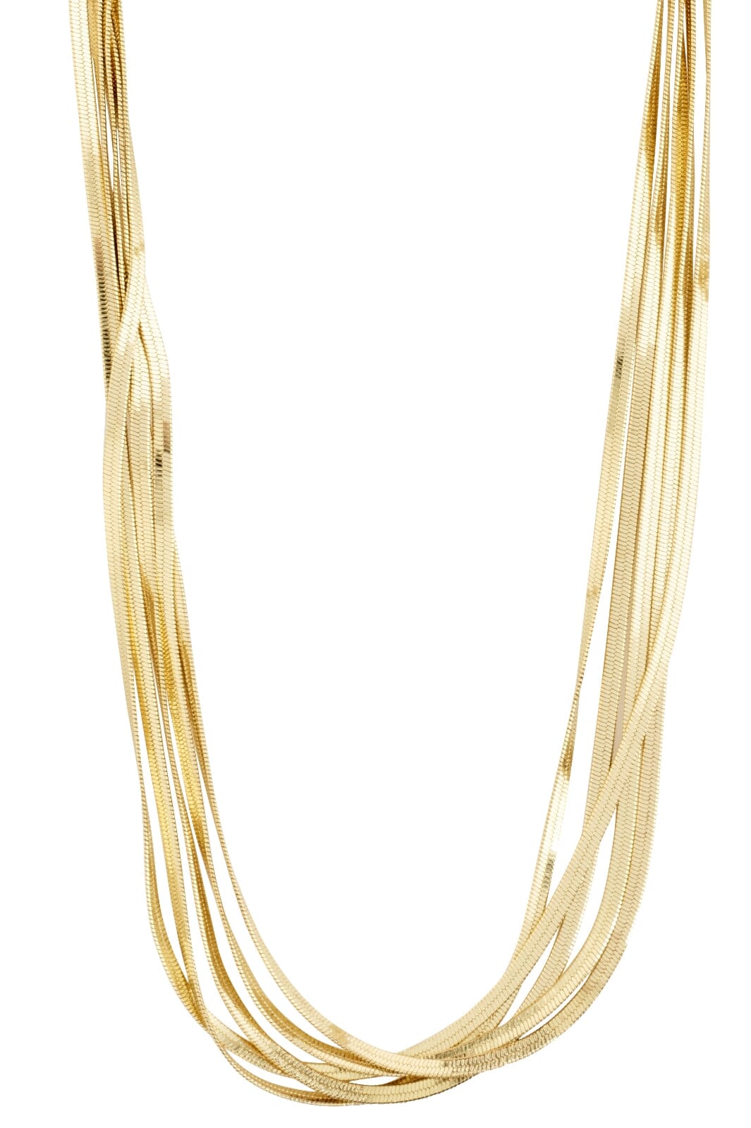Gullbelagt halskjede fra Pilgrim med flere strenger. Den blanke overflaten reflekterer lyset og skaper dybde i designet. Halskjeden har en flott gyllen farge.