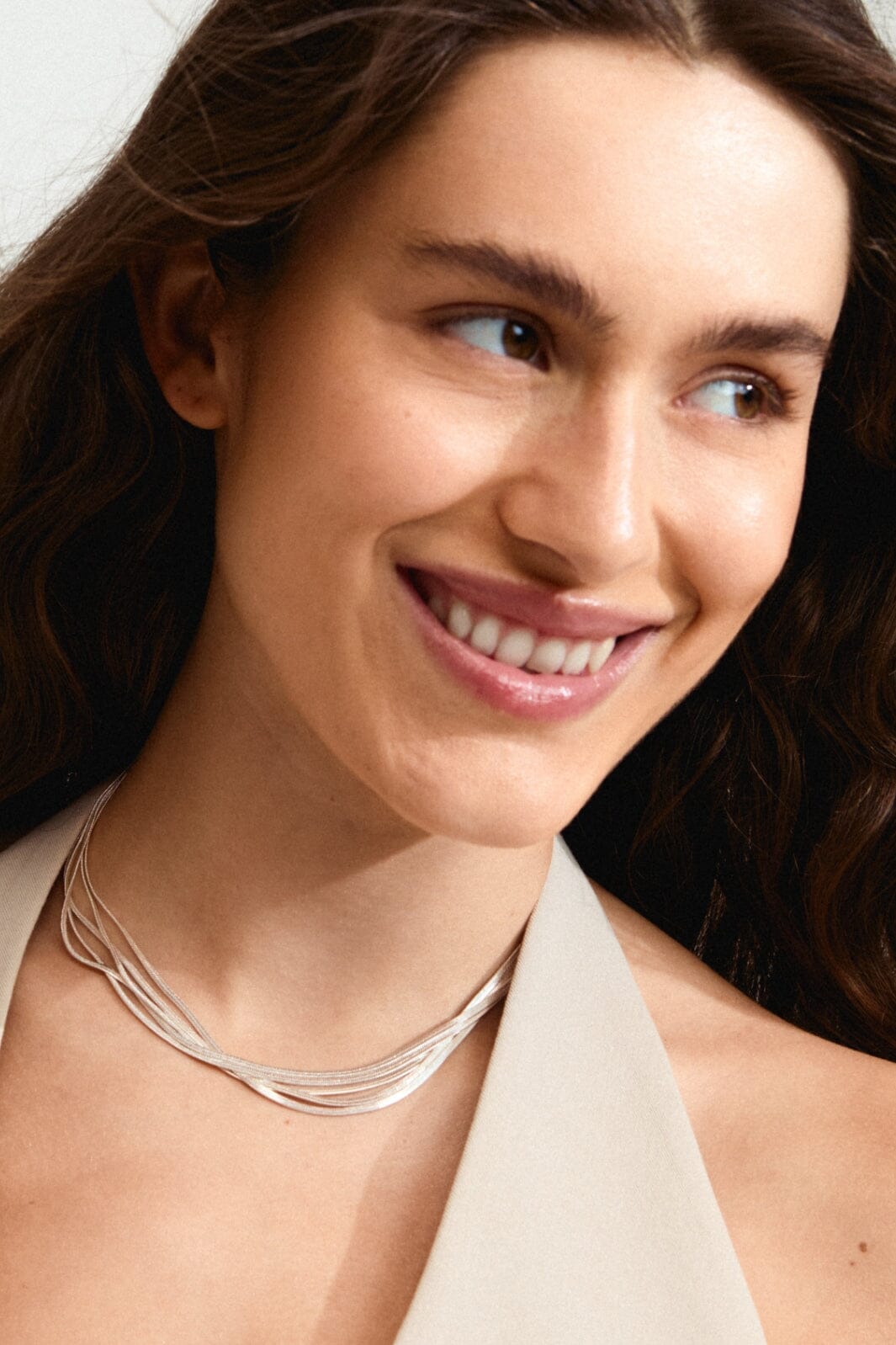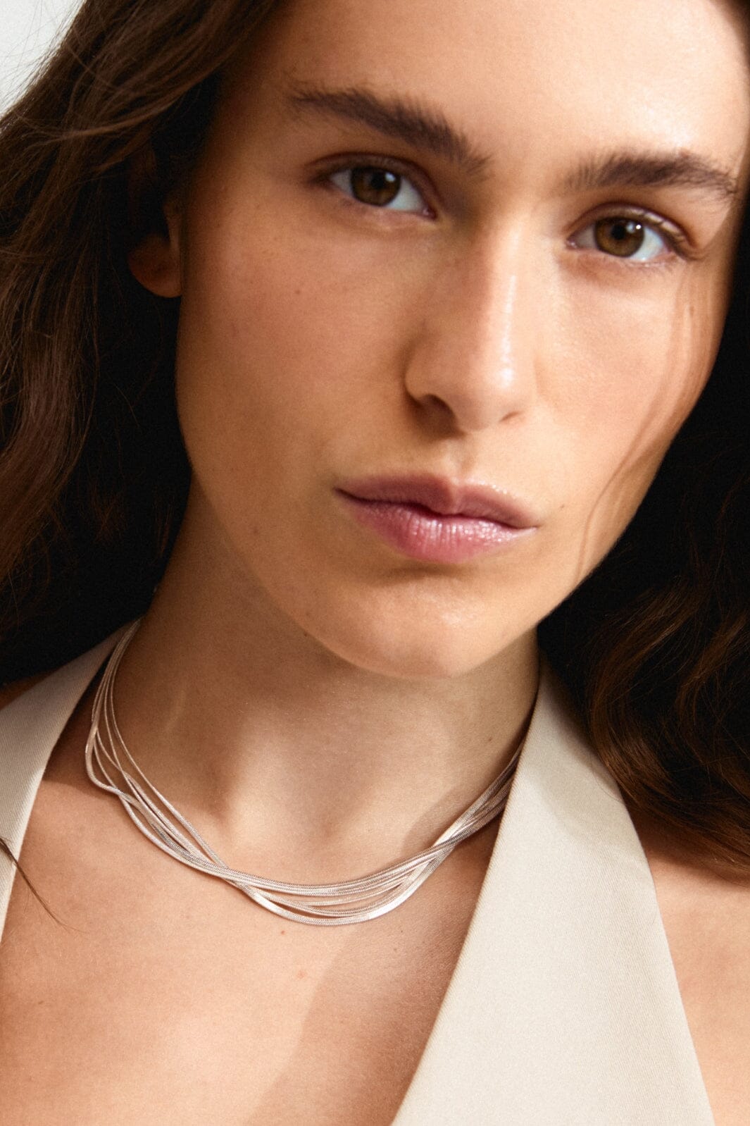Sølvbelagt halskjede fra Pilgrim med flere strenger. Halskjede er laget av resirkulert messing med en sølvbelagt overflate som gir den et blankt og rent uttrykk.