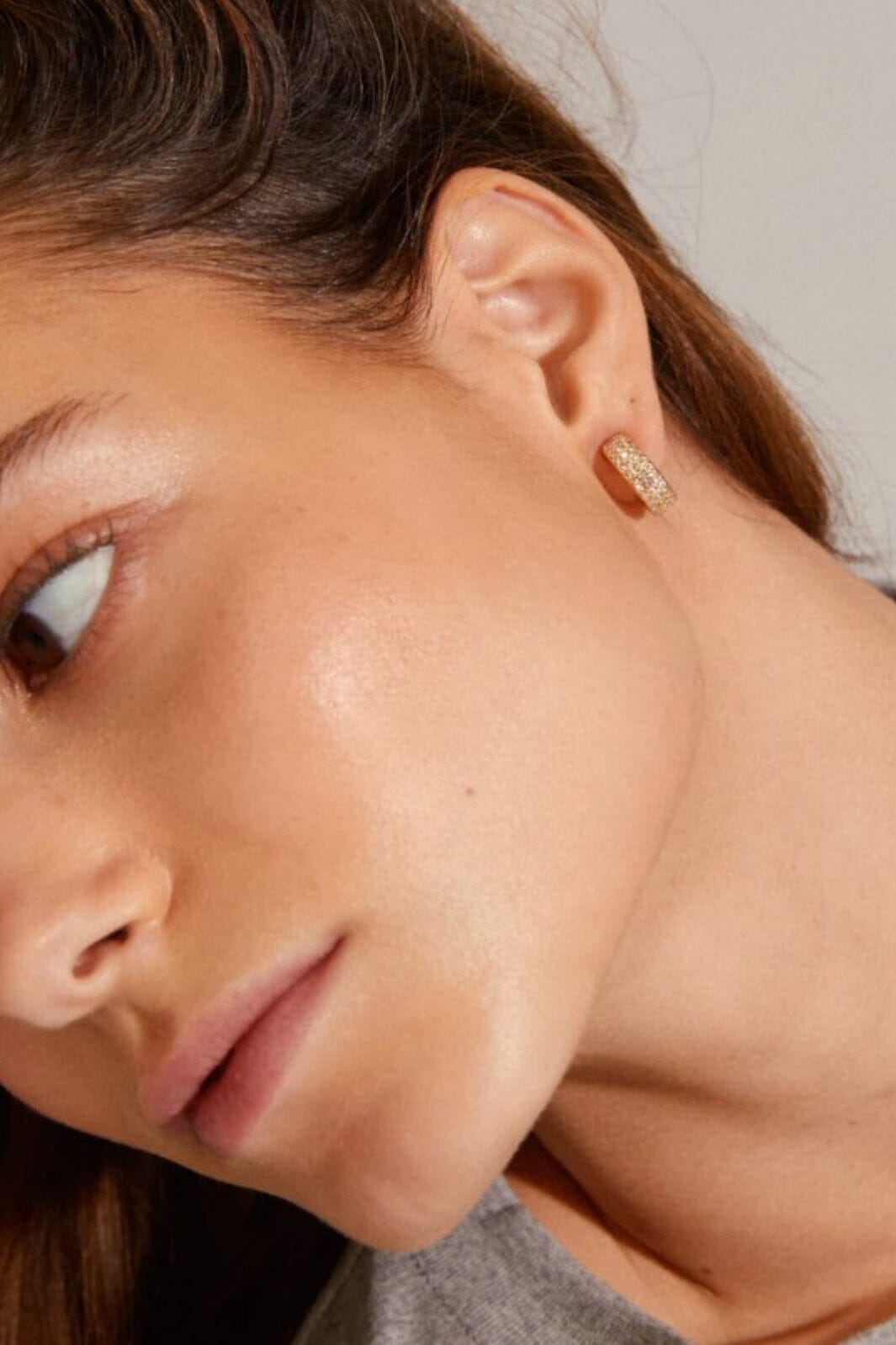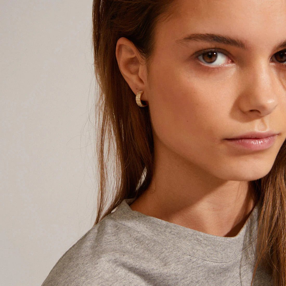 Gullbelagte øredobber fra Pilgrim med Preciosa-krystaller. Øredobbene har en buet form på 14 mm og er dekorert med krystaller i et mønster som fanger lyset.