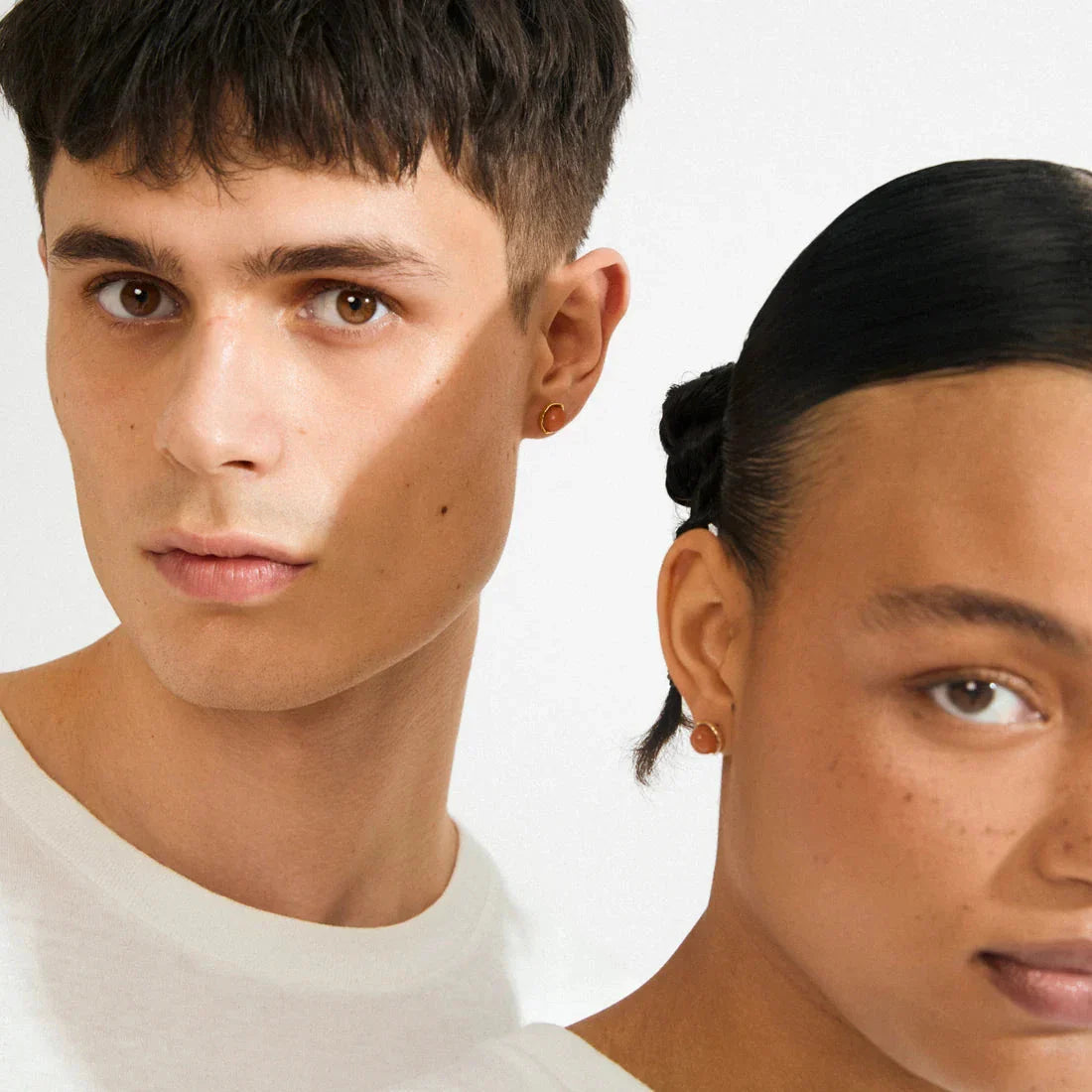 Gullbelagte øredobber fra Pilgrim med oransje aventurinstein. Steinene har en rund form og sitter i en gullfarget innfatning med ørestikker.