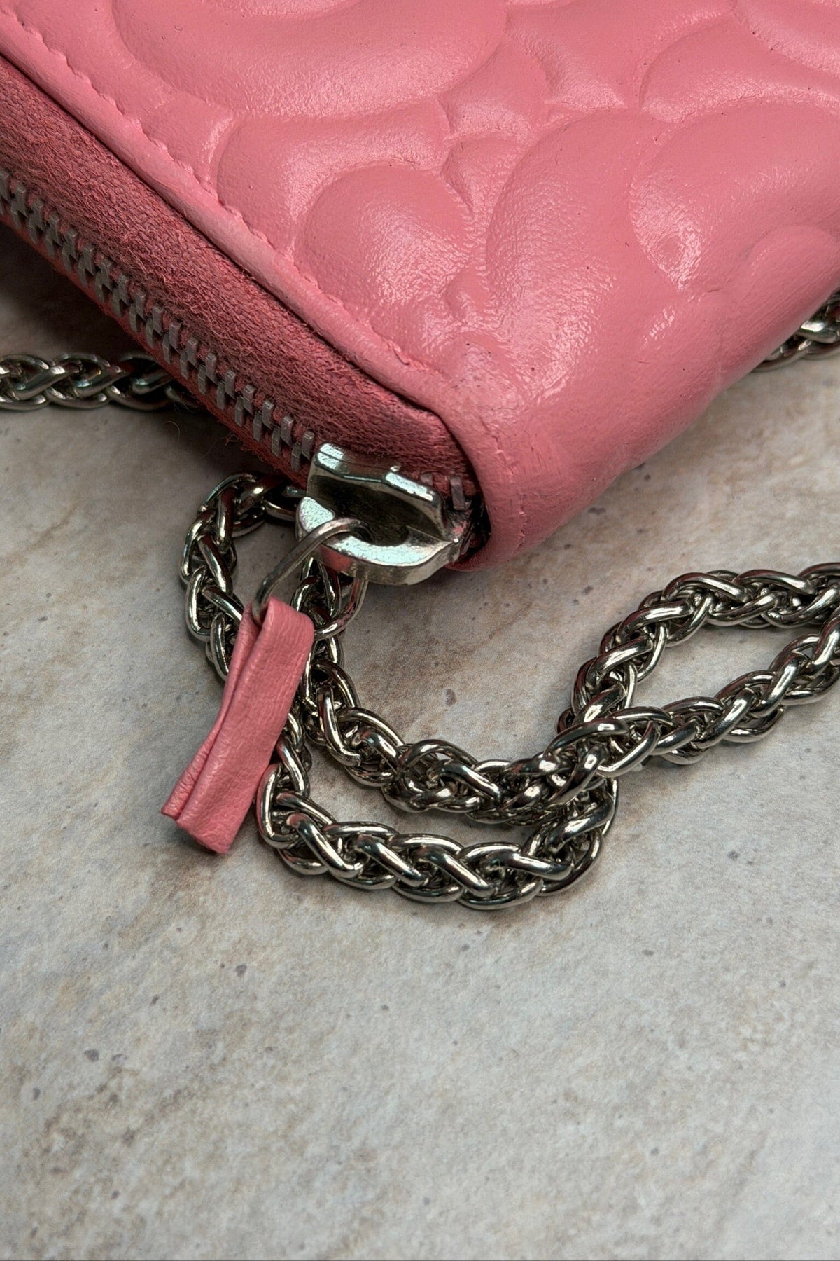 Rosa lommebok fra Chanel med blomstermønster og kjederem. Produktet er fra Preloved Vintageline x Molly&My og er i god, men brukt stand.