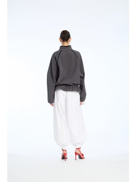 Grå fleecejakke fra Rotate med smale nålestriper. Jakken har en halv glidelås og dekorative sømmer langs ermene.