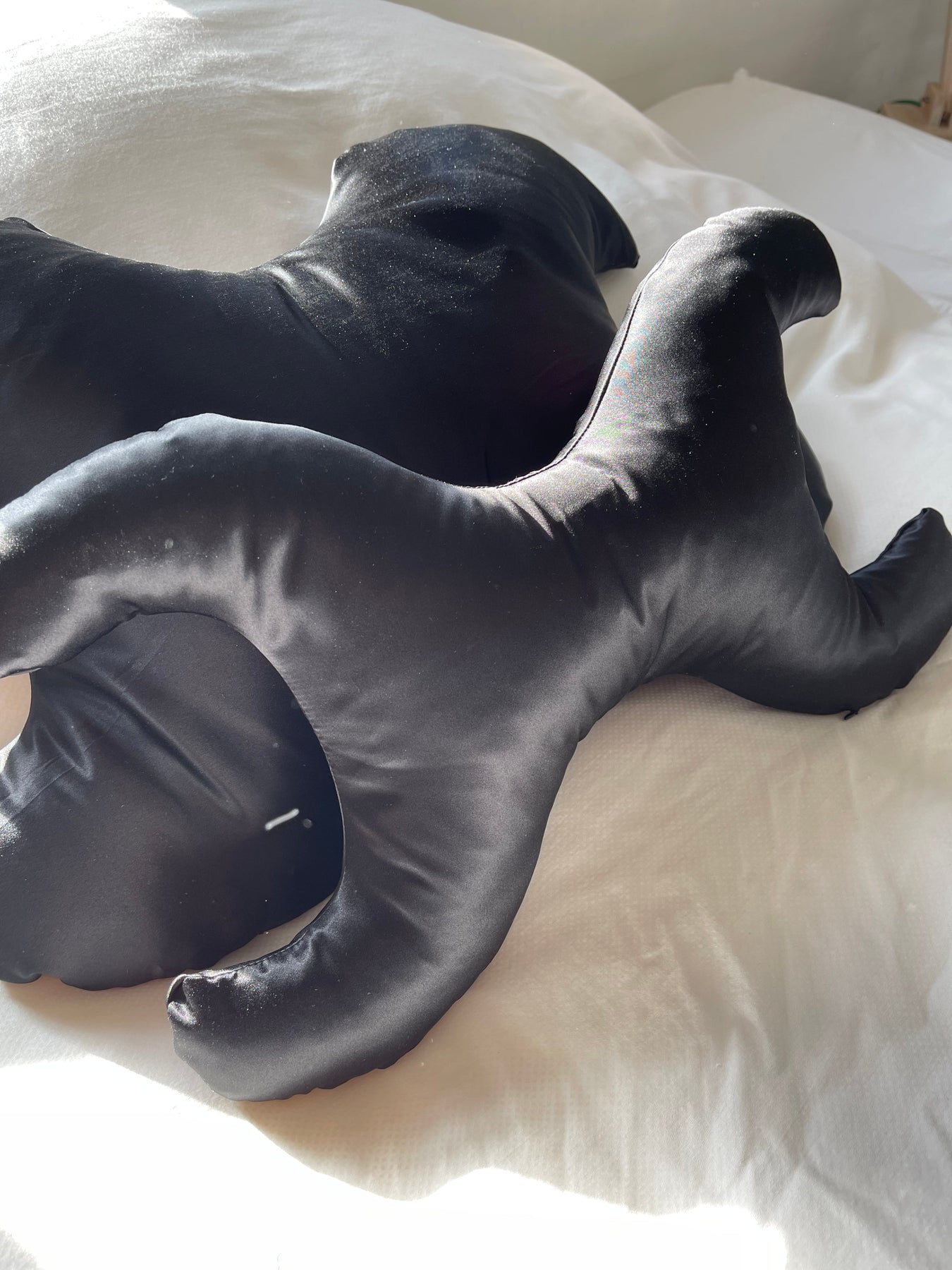Sort silkebetræk fra Save My Face til La Petite-puten. Betrækket er laget av charmeuse-silke med antiseptiske egenskaper som beskytter mot hudirritasjoner gjennom natten.