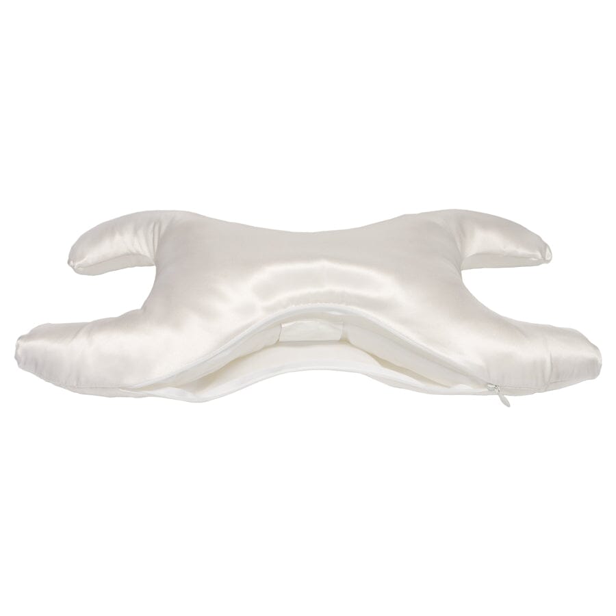Hvitt putetrekk fra Save My Face i charmeuse-silke med timeglassform. Trekket har temperaturregulerende og antiseptiske egenskaper som gjør det egnet for nattsøvn.