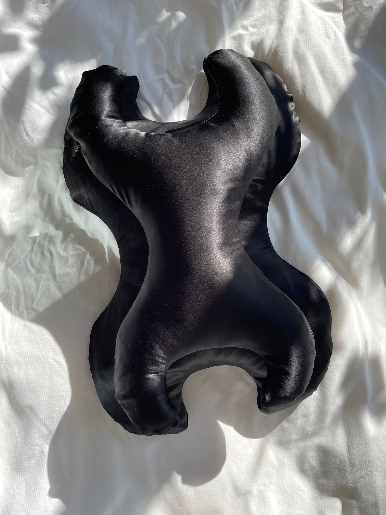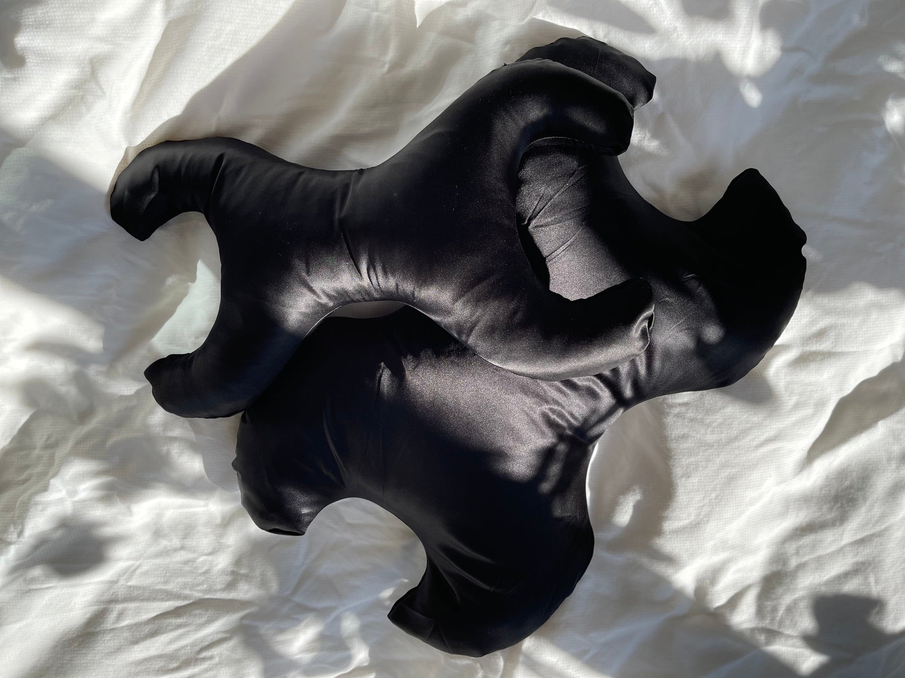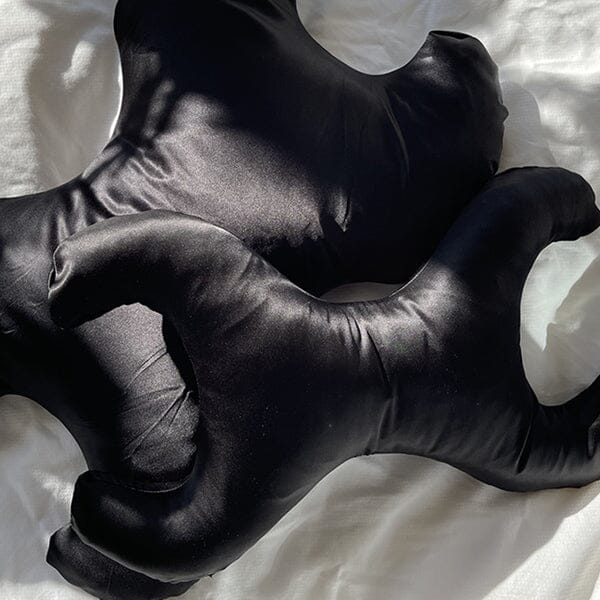 Svart pute fra Save My Face med silkebetrakk. Putene har en spesiell form og er fylt med syntetiske fibre som er motstandsdyktige mot bakterier.
