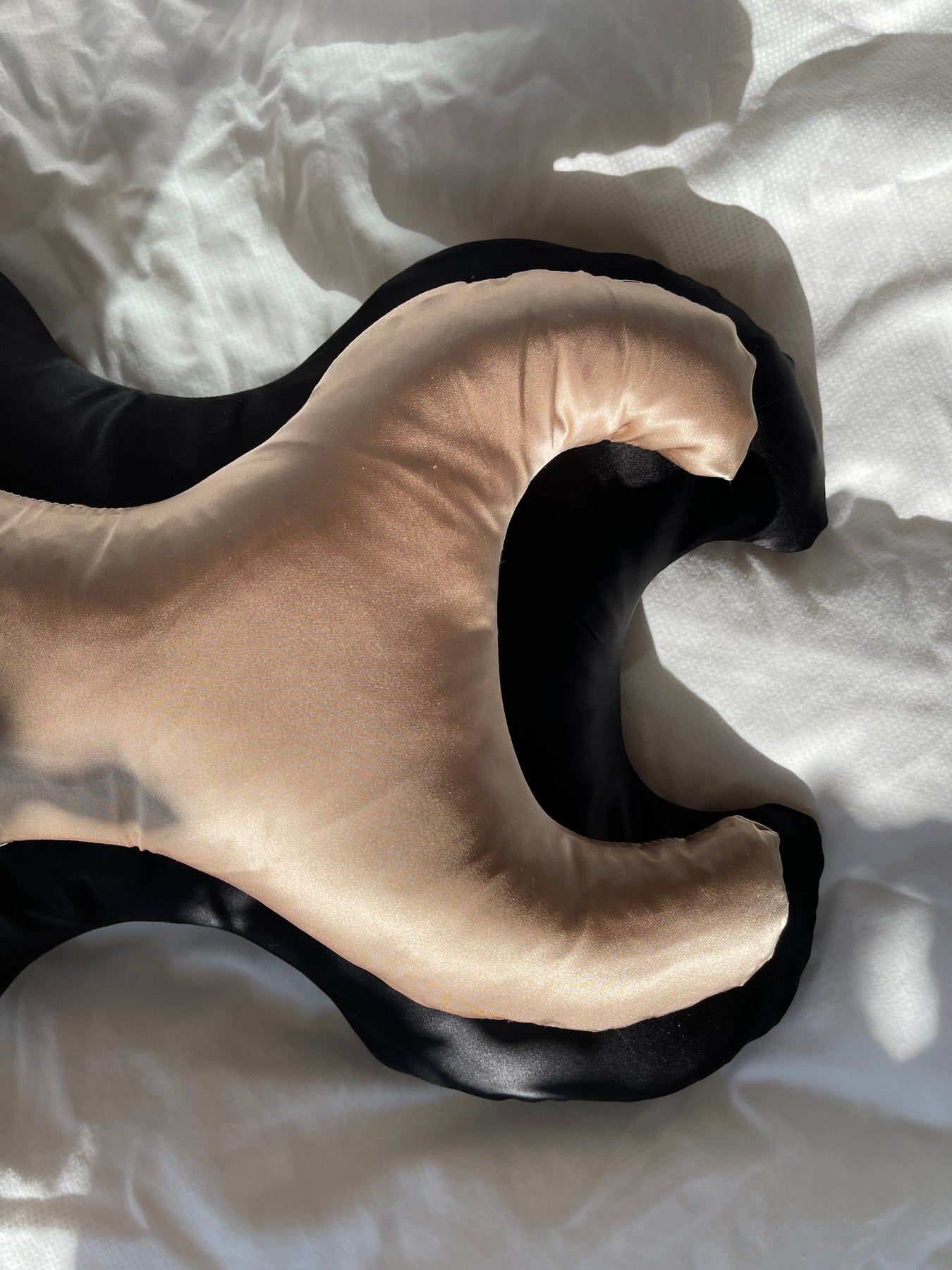 Liten pute med bronsefarget silkebetræk fra Save My Face. Putten har et X-formet design og kombinerer allergivennlige fibre med temperaturregulerende silke.