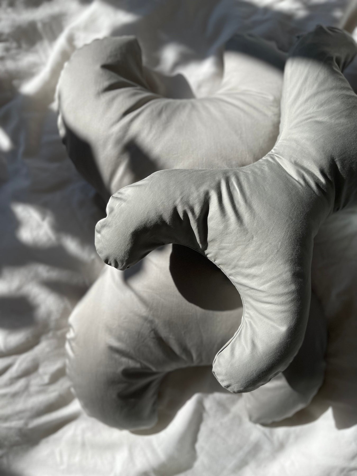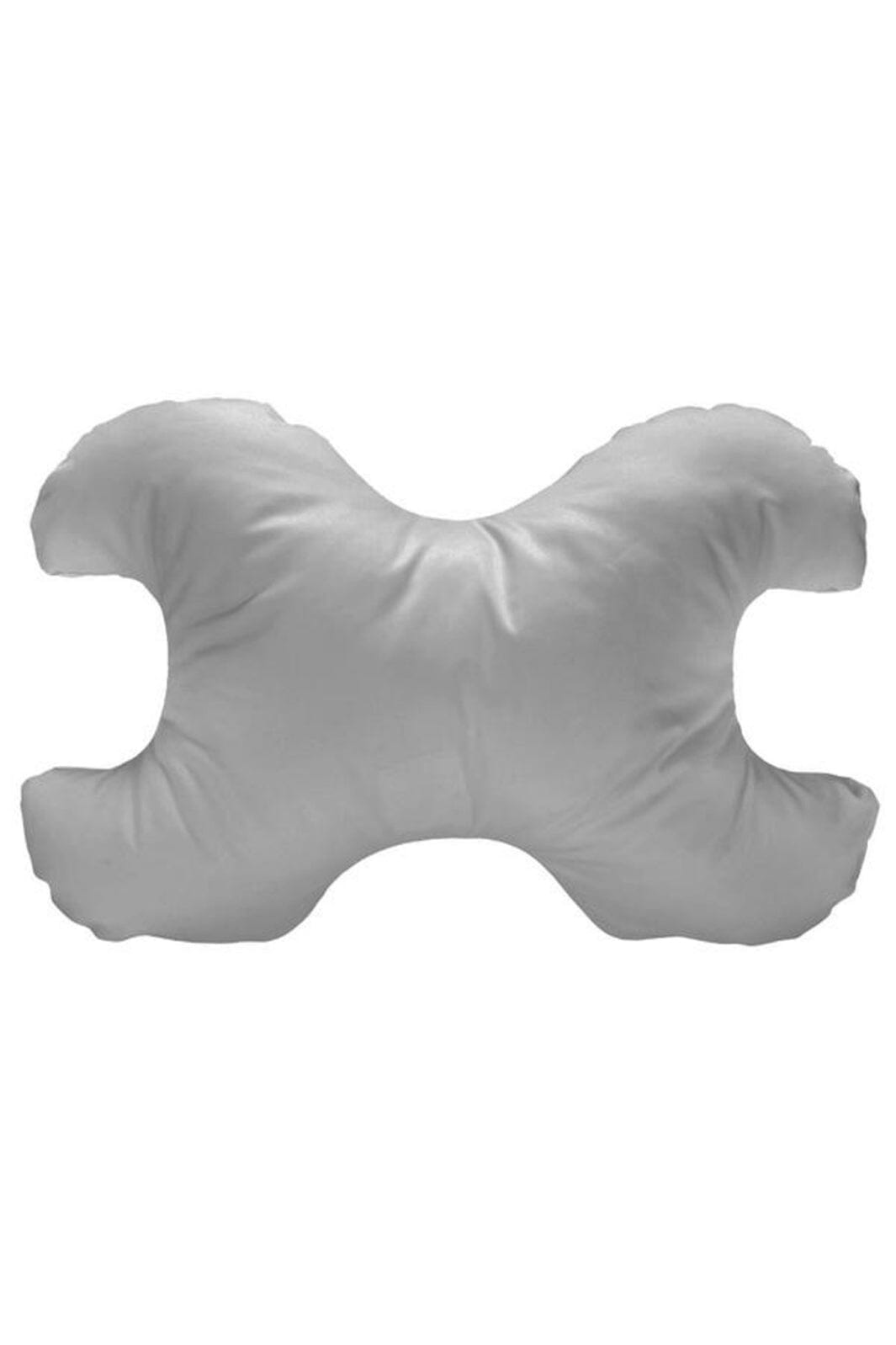 Grå pute med patentert timeglassform fra Save My Face. Den spesielle utformingen holder ansiktet fritt under søvn, og det avtagbare trekket gjør den enkel å holde ren.