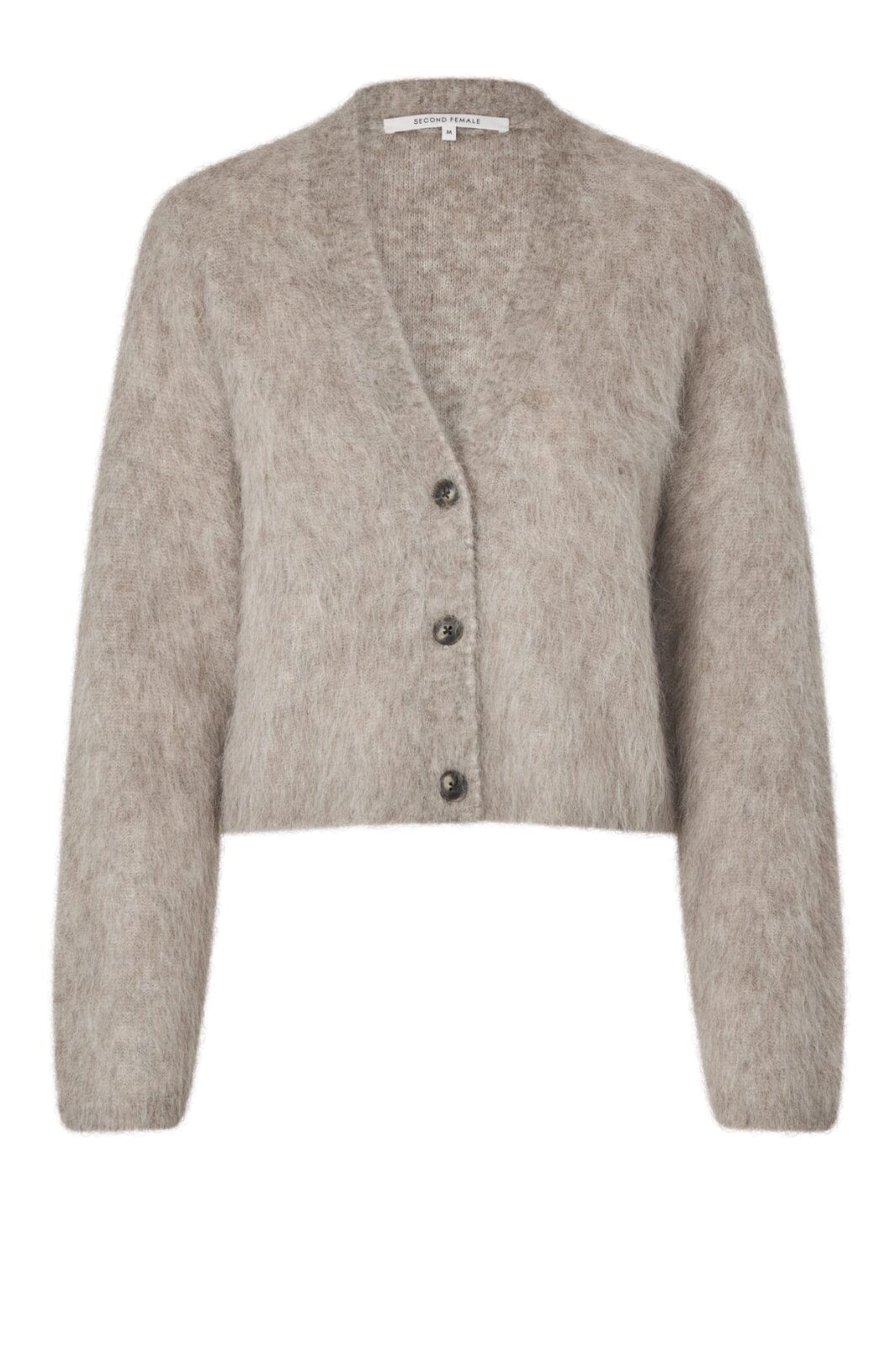 En strikket cardigan fra Second Female i en lys brun farge. Cardiganen har en myk, fluffy tekstur og en avslappet passform.