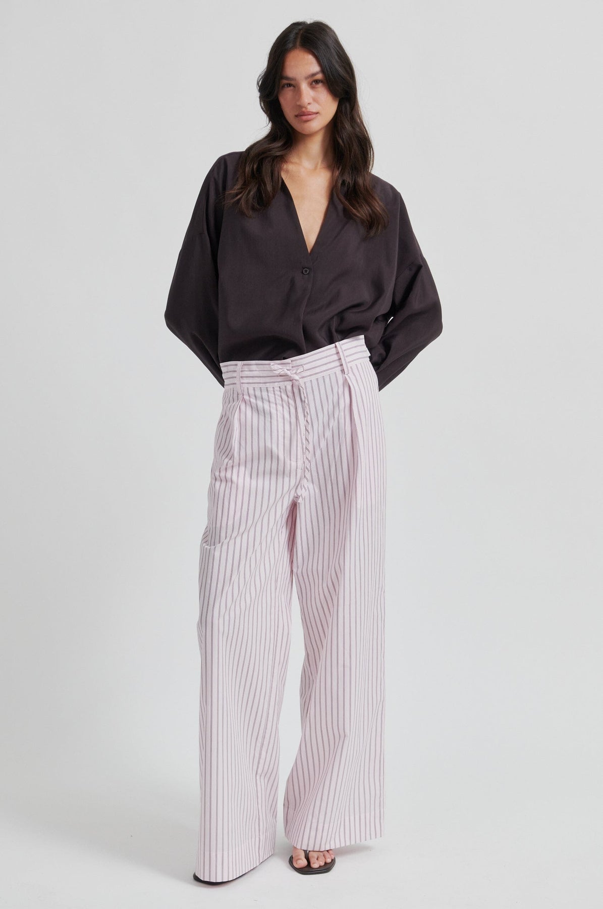 Bukser fra Second Female i lyse lilla bomull med vertikale striper. Buksene har vide, rette ben og en løs passform.
