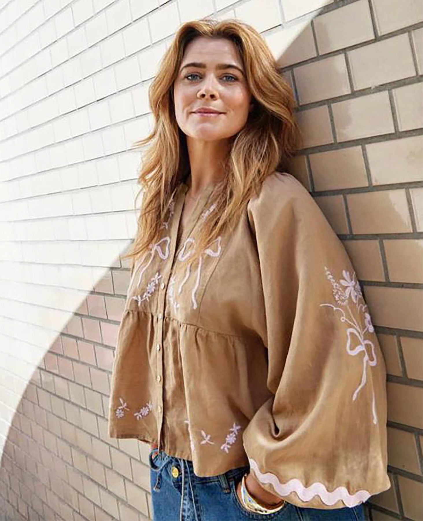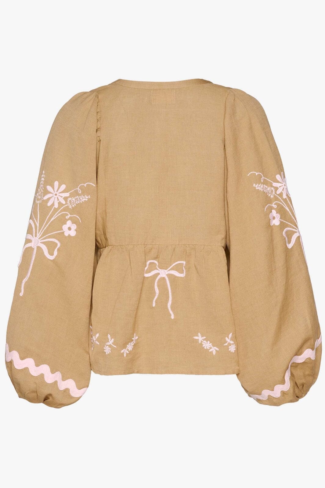 Lys brun topp fra Sissel Edelbo med V-hals og knapper foran. Toppen har pufferm med mansjetter og er dekorert med lyserødt broderi og sløyfer på for- og baksiden.