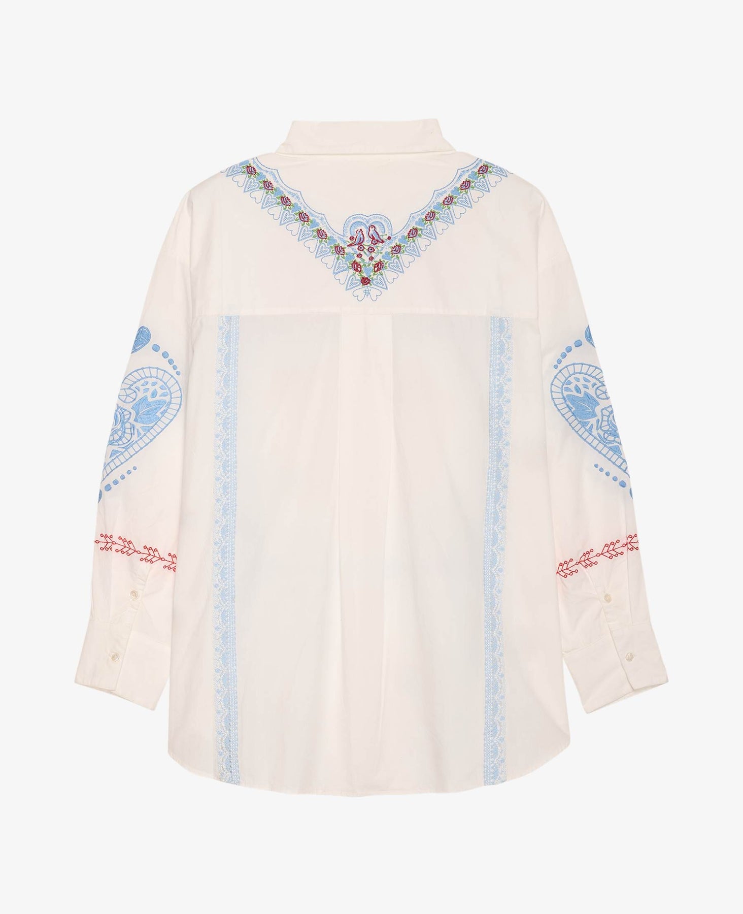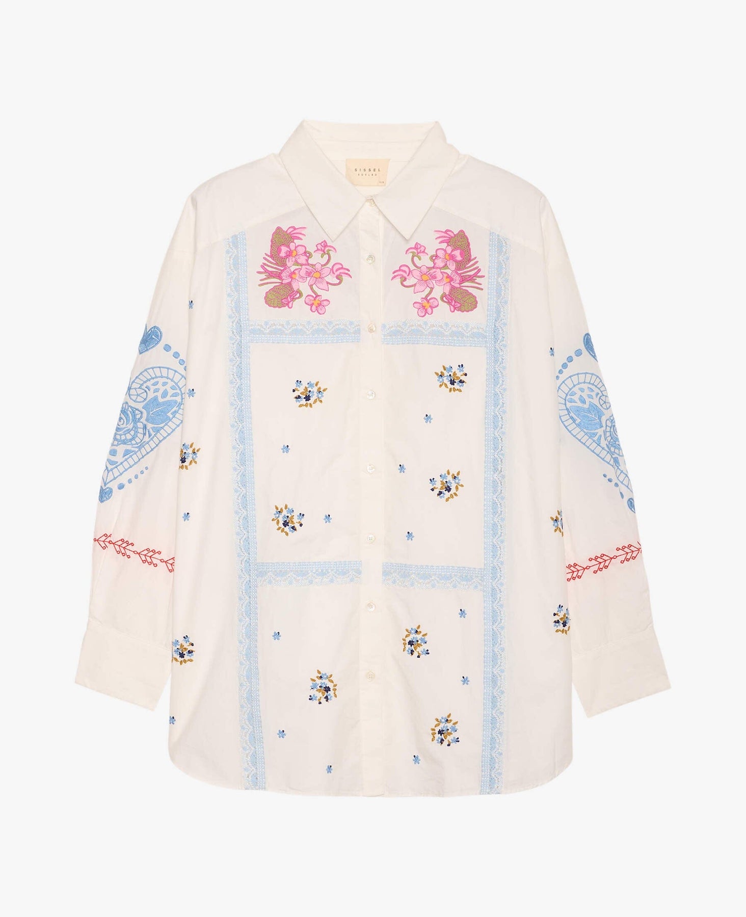 Hvit skjorte fra Sissel Edelbo med broderte blomster og hjerter i rosa og blå nyanser samt fine blonder langs ermene.