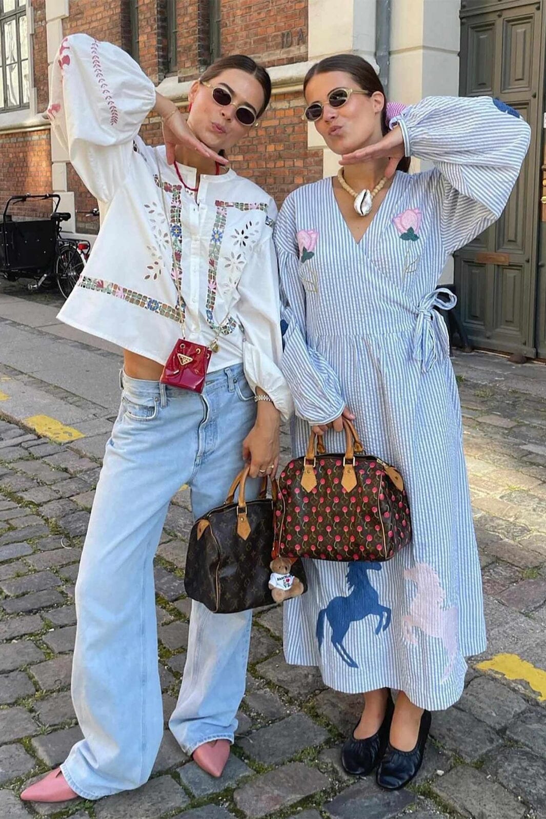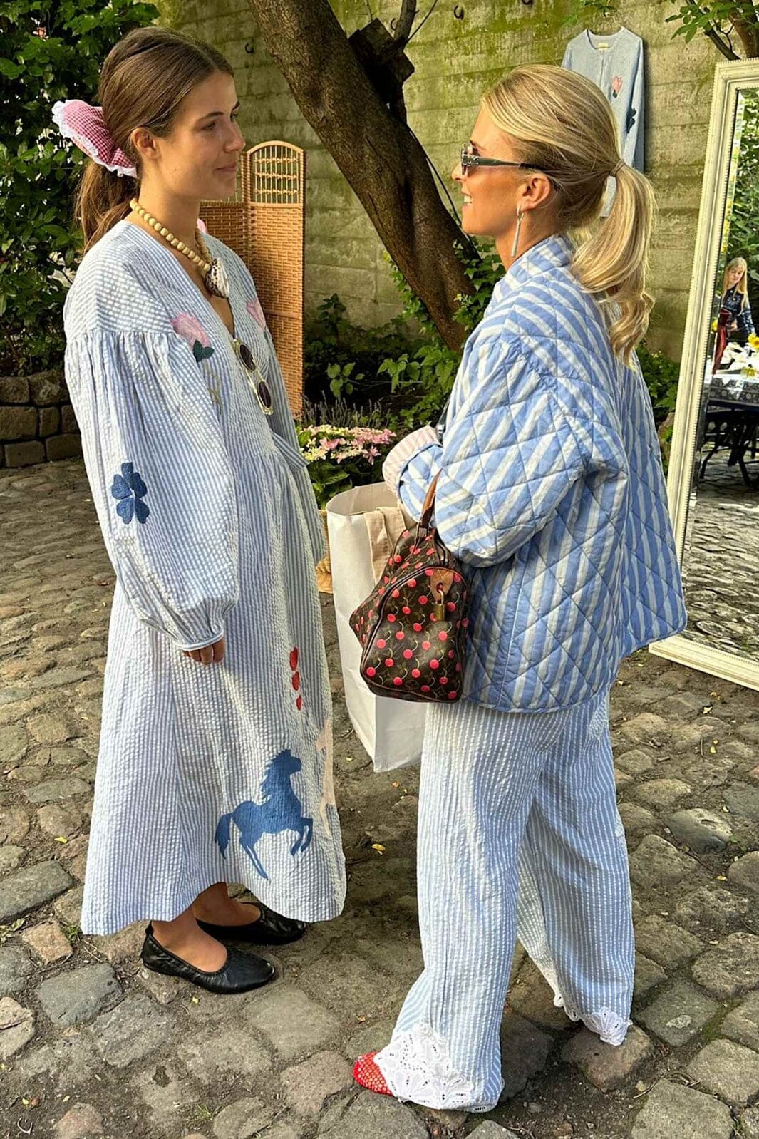 Omslagskjole fra Sissel Edelbo i stripete seersucker-stoff. Kjolen har broderte hest- og blomsterdesign på for- og bakside. De lange ermene og v-halsen gir kjolen et feminint uttrykk.