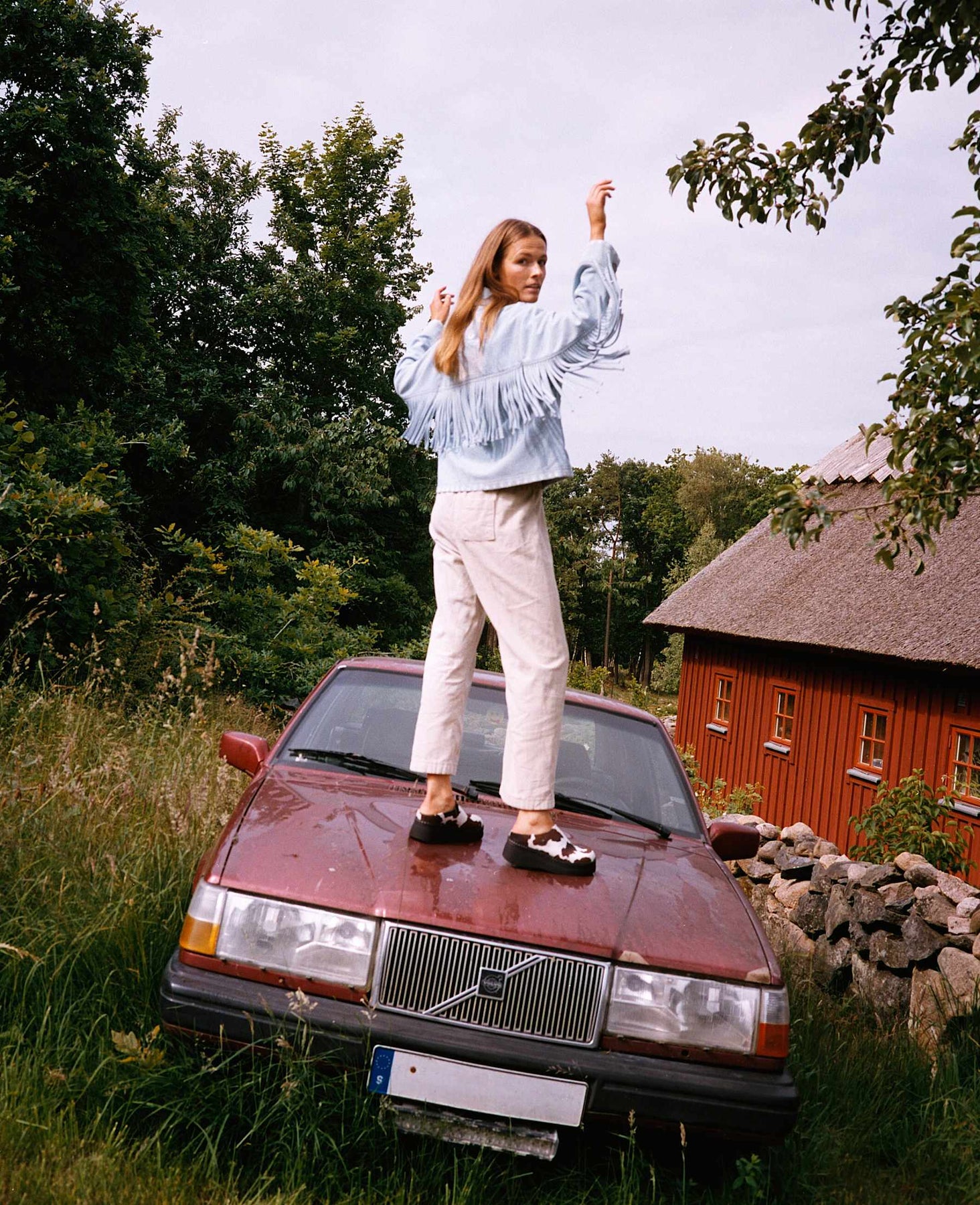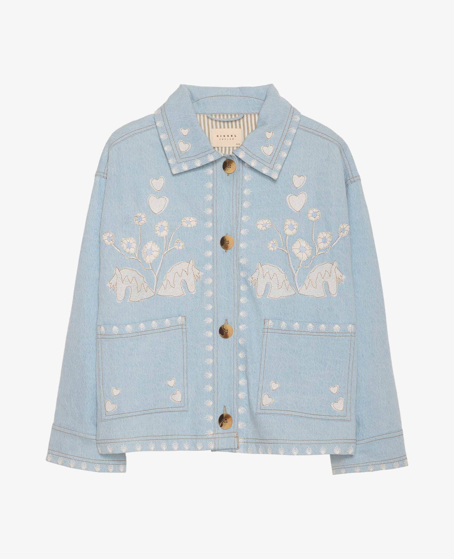 Denimjakke fra Sissel Edelbo, laget av overskuddsdenim i en lys blå nyanse. Jakken har en oversized passform, formede ermer og en stor krage med knappelukking.