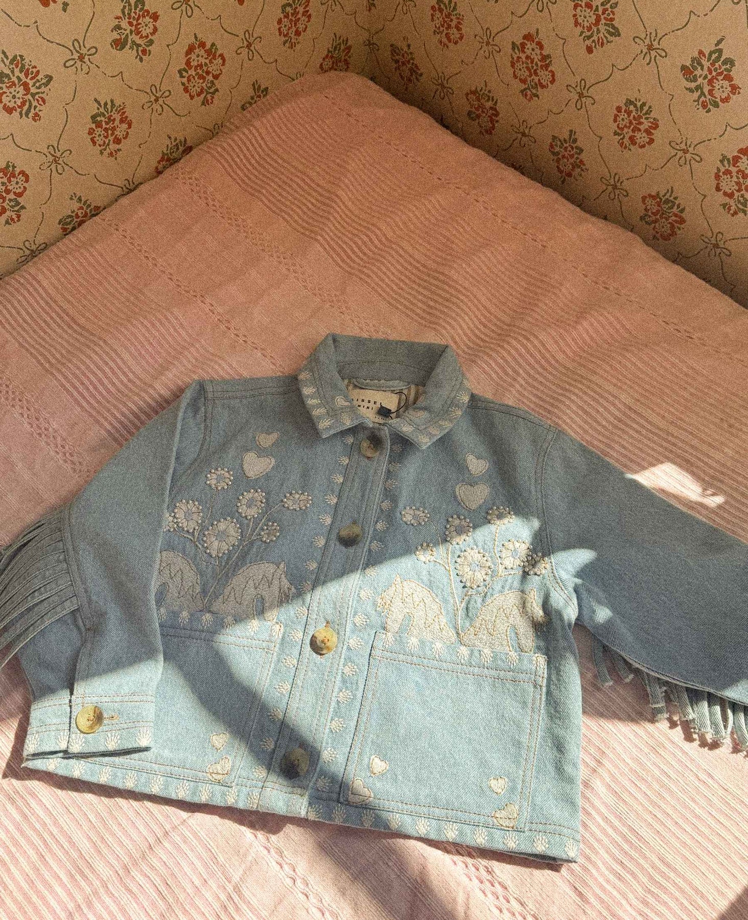 Lys blå denimjakke fra Sissel Edelbo med broderte blomster og hjerter. Jakken har en oversized passform med skjortekrage og knapper hele veien ned.