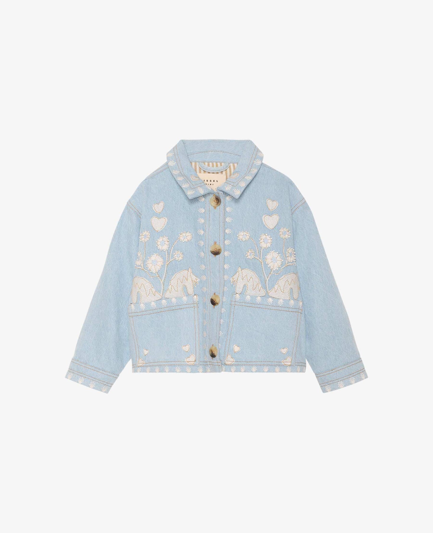 Lys blå denimjakke fra Sissel Edelbo med broderte blomster og hjerter. Jakken har en oversized passform med skjortekrage og knapper hele veien ned.