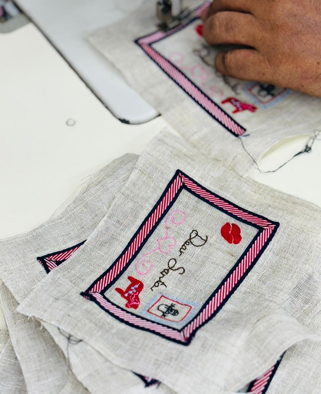 Juleoppheng fra Sissel Edelbo, laget av lin i en beige nyanse. Ornamentet har brodert tekst og dekorasjoner med juletema.