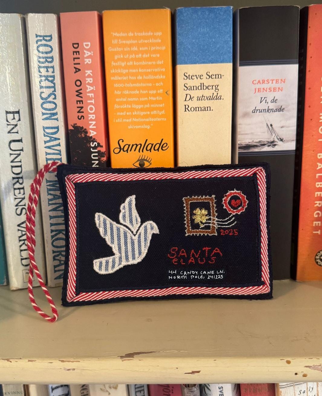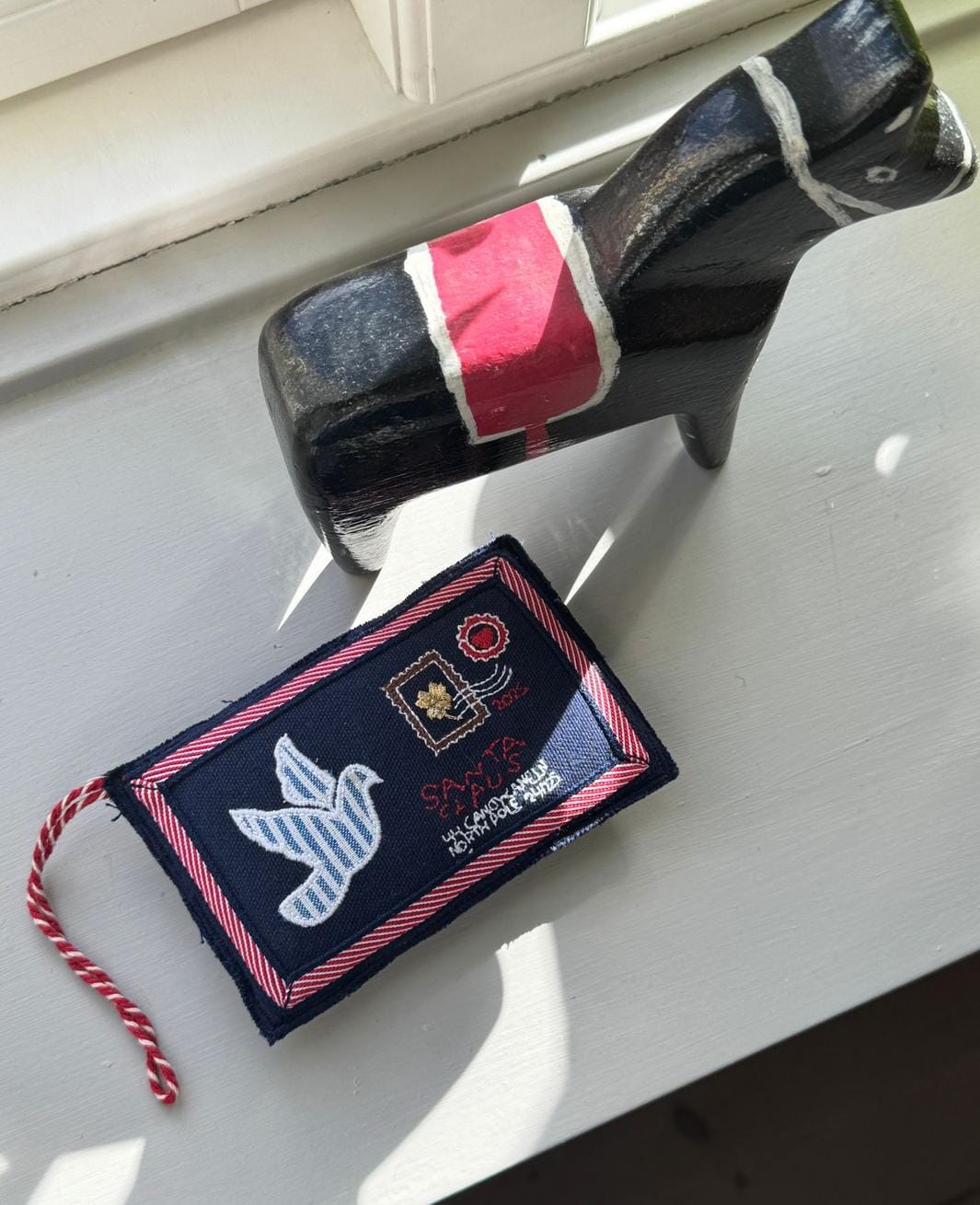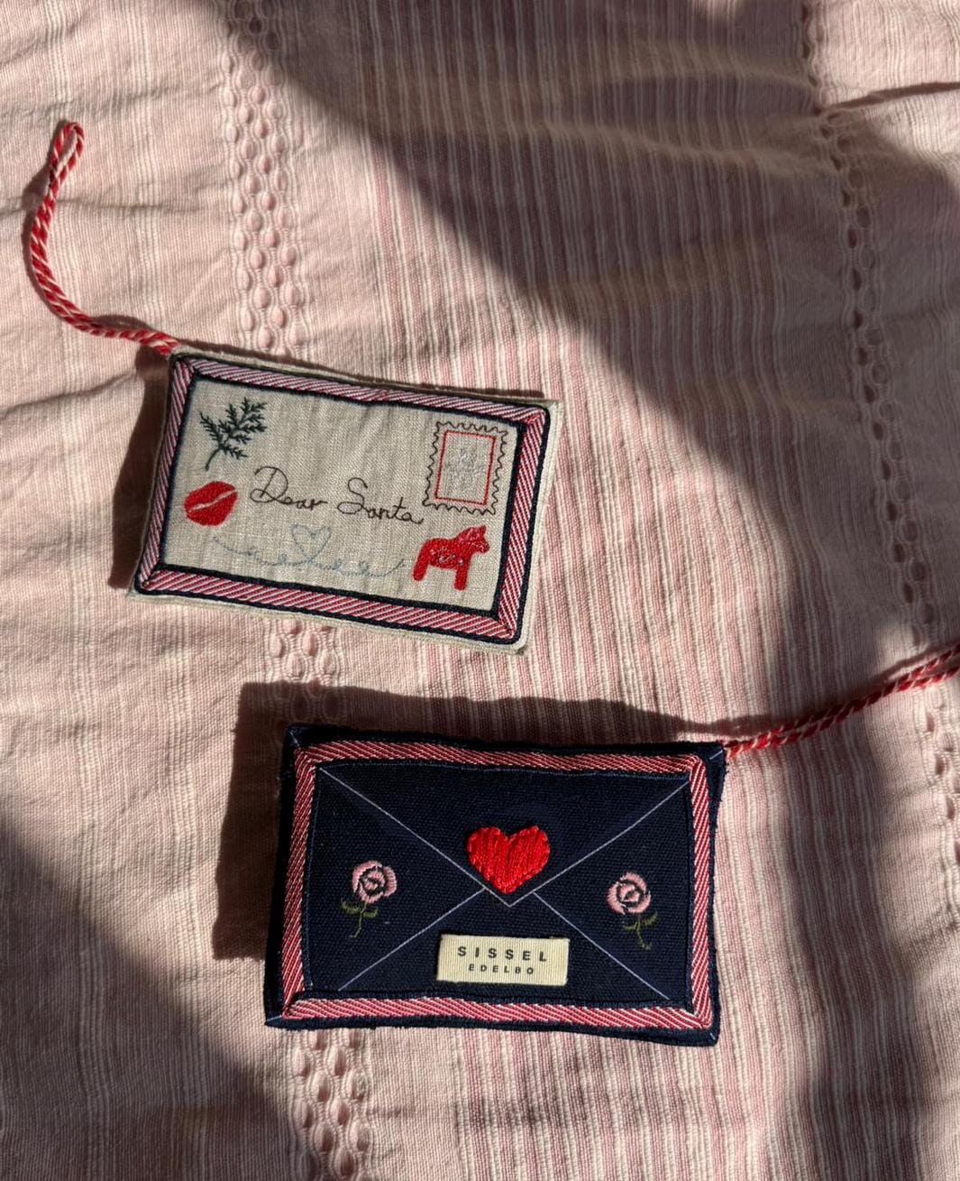 Julepynt fra Sissel Edelbo formet som en konvolutt i mørkeblå bomull. Ornamentet har en fredsdueapplikasjon og broderte detaljer med hjerter, roser og frimerker.