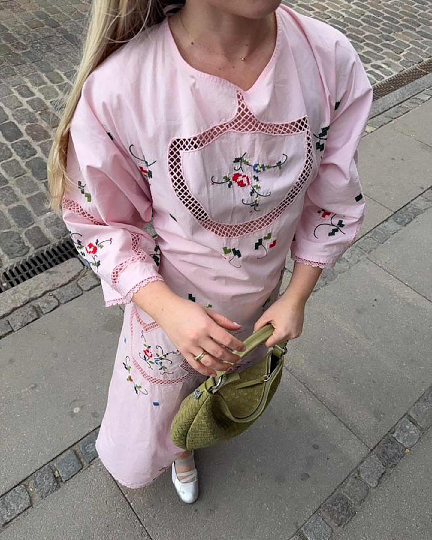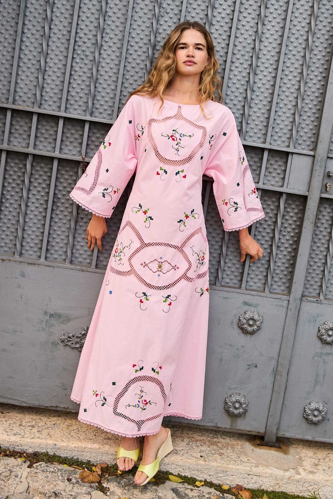 Lang kjole fra Sissel Edelbo i lys rosa bomull med broderte blomstermønstre. Kjolen har åpen rygg med snøring og gjennomsiktige blondedetaljer.